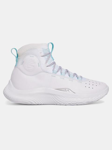 What do you get when you cross Curry 4 x Curry 11?The locked-in control of Curry 4's knit, leather, and suede upper + the light, grippy speed of rubberless UA Flow. This unreal combo will leave your defenders a step behind. Product Details - Comfortable bootie design with UA IntelliKnit stretch collar for improved ease of access - Strategic perforations for breathability in high-heat zones & leather & suede overlays for added durability - New UA Flow cushioning technology is super-light, bouncy & provides insane grip - Durable UA Flow outsole provides better court feel so you can cut & stop/start faster than ever before Size & Fit - Regular Space & Care - Style #: 3024861 - Weight: 11.85 oz. - Lace type: Standard tie - Imported