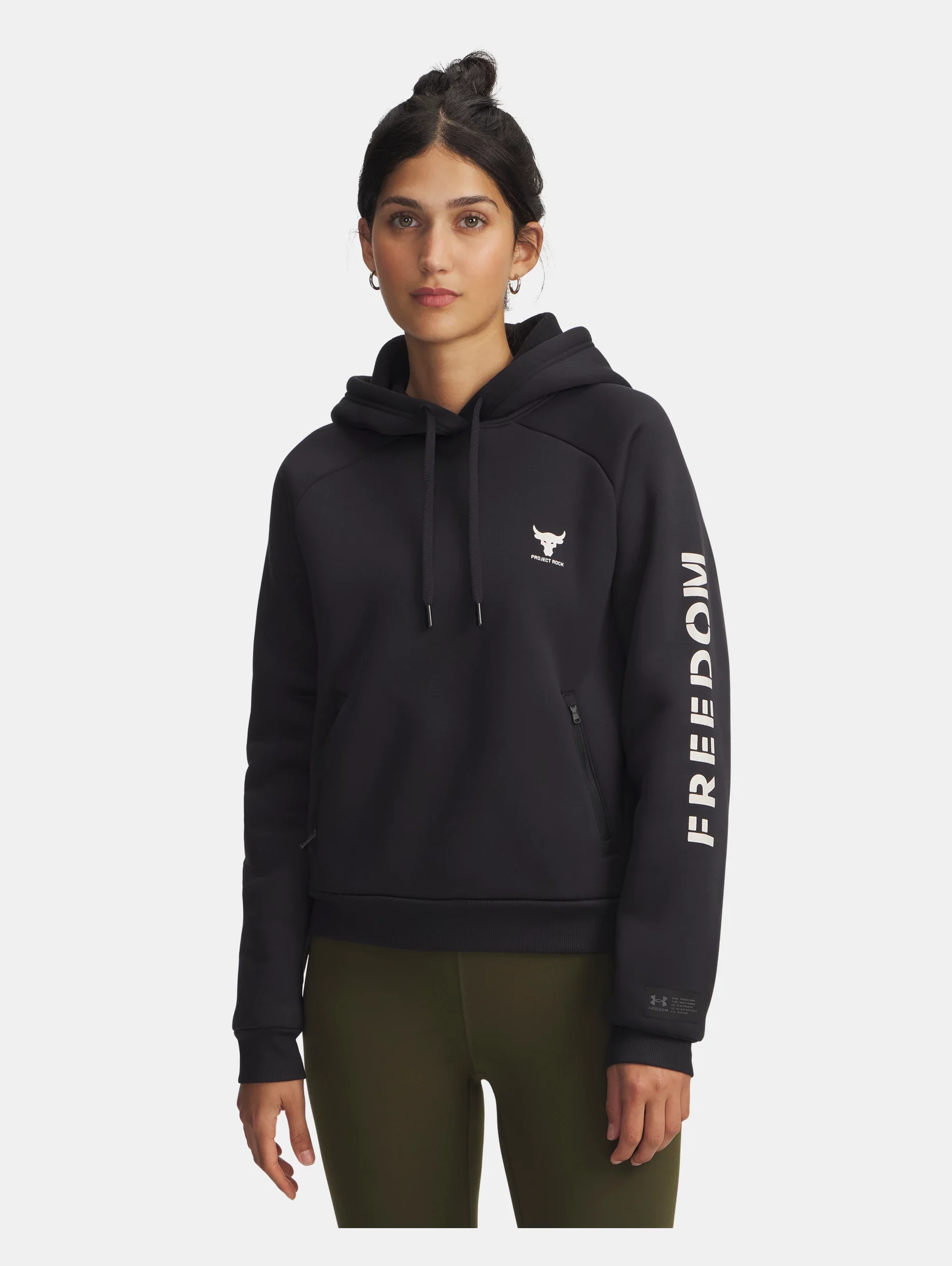Project Rock training gear was built to help you find boundaries, then push right through them.Everything in this collection was personally approved by Dwayne Johnson, the hardest worker in the room. ANY room. Product Details - Armour Fleece® is light, breathable & stretchy for warmth that still lets you move - Soft inner layer traps heat to keep you warm & comfortable - Front kangaroo pocket - Main body fabric contains at least 90% recycled polyester, excluding trims & embellishments Size & Fit - Fuller cut for complete comfort. Space & Care - Style #: 1389272 - 100% Polyester - Imported