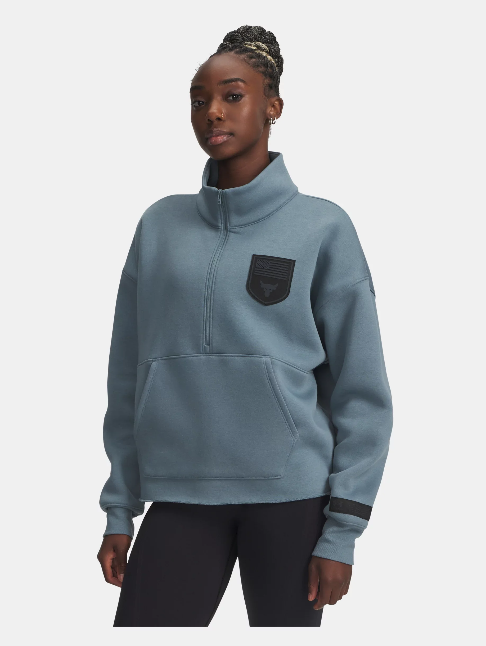 Project Rock training gear was built to help you find boundaries, then push right through them.This ½ zip was personally approved by Dwayne Johnson, the hardest worker in the room. ANY room. Product Details - Ultra-soft cotton-blend fleece with brushed inside for extra warmth - Front kangaroo pocket - Generous ½ Zip front makes for easy layering - Ribbed cuffs - Drop hem shoulder Size & Fit - Fuller cut for complete comfort. Space & Care - Style #: 6006267 - 80% Cotton/20% Polyester - Imported