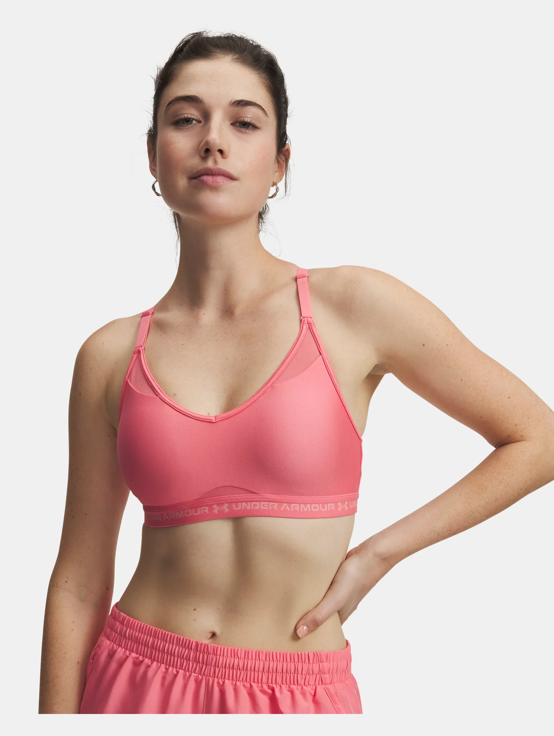 The everyday low-impact sports bra with so much attention to detail it could only come from us.Easy on and off, classic compressive support, and a soft sweat-wicking design with removable pads. Perfect support for low-impact workouts like yoga, pilates, and walking. Validated by our wear testers so you *know* it hits. Product Details - Built for Light-Support activity & all-day comfort - Removable cups for enhanced shape & coverage - Mesh panels at front neckline & lower bust for added breathability - Quick & easy adjusts on front of straps for a custom fit - Deep V neckline & exposed elastic bottom band with wordmark detail - HeatGear® fabric delivers superior next-to-skin feel, wicks sweat & dries really fast - Odor control technology minimizes odor - UPDATED SIZING: We revamped our bra sizing so you can find a fit that feels custom to your unique shape—check the size chart to find your perfect match Size & Fit - Ultra-tight, second-skin fit. Space & Care - Style #: 1386424 - 87% Polyester/13% Elastane - Imported - Remove pads before washing - Machine wash cold with like colors - Do not bleach - Tumble dry low - Do not iron - Do not use softeners - Do not dry clean
