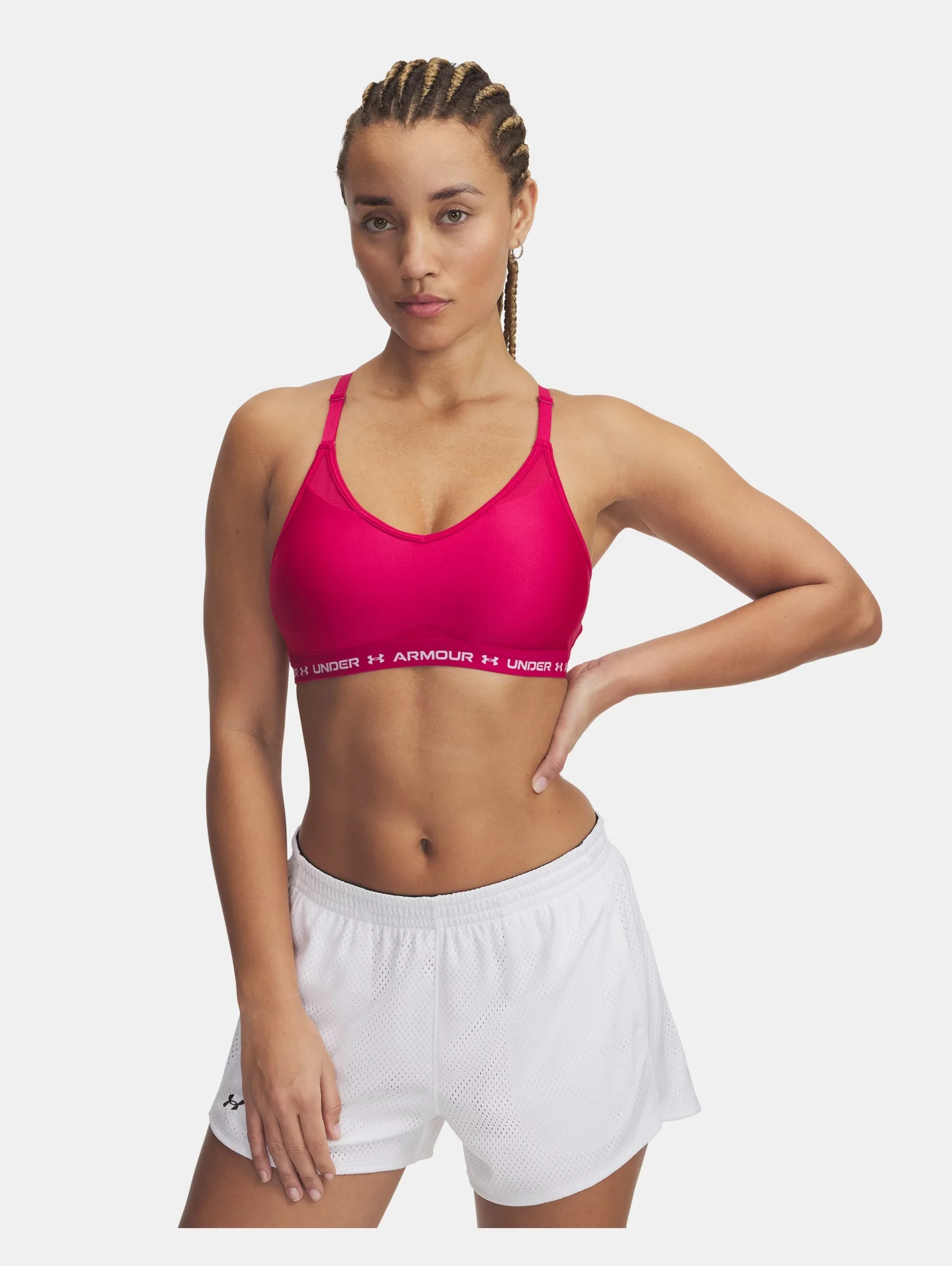 Unique crossback strap design delivers extra support in all the right places but still staying incredibly comfortable. Product Details - Built for Light-Support activity & all-day comfort - Removable cups for enhanced shape & coverage - Mesh panels at front neckline & lower bust for added breathability - Quick & easy adjusts on front of straps for a custom fit - Deep V neckline & exposed elastic bottom band with wordmark detail - HeatGear® fabric delivers superior next-to-skin feel, wicks sweat & dries really fast - Odor control technology minimizes odor - UPDATED SIZING: We revamped our bra sizing so you can find a fit that feels custom to your unique shape—check the size chart to find your perfect match Size & Fit - Ultra-tight, second-skin fit. Space & Care - Style #: 1386424 - 87% Polyester/13% Elastane - Imported - Remove pads before washing - Machine wash cold with like colors - Do not bleach - Tumble dry low - Do not iron - Do not use softeners - Do not dry clean