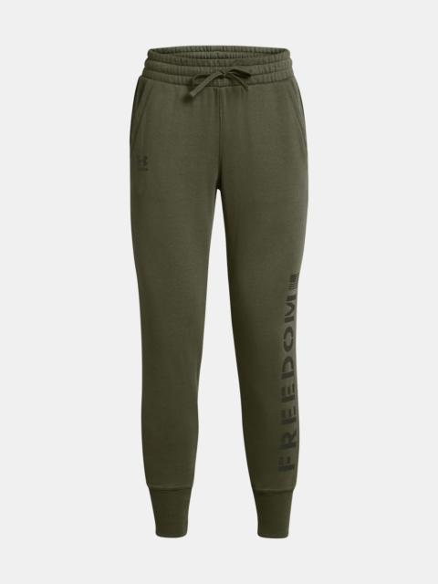 UA Freedom's goal is to support and inspire the brave men and women dedicated to protecting us, every day. Product Details - Ultra-soft cotton-blend fleece with brushed inside for extra warmth - Encased elastic waistband with external drawcord - Open hand pockets - Main body fabric engineered to reduce fiber shedding leveraging Under Armour's Fiber Shed Test Method Size & Fit - Fuller cut for complete comfort. Space & Care - Style #: 1386357 - Inseam: 27.625" - Pockets: Yes - 56% Cotton/44% Polyester - Imported - Tapered leg fit with ribbed cuffs - Machine wash cold with like colors - Do not bleach - Tumble dry low - Do not iron - Do not use softeners - Do not dry clean