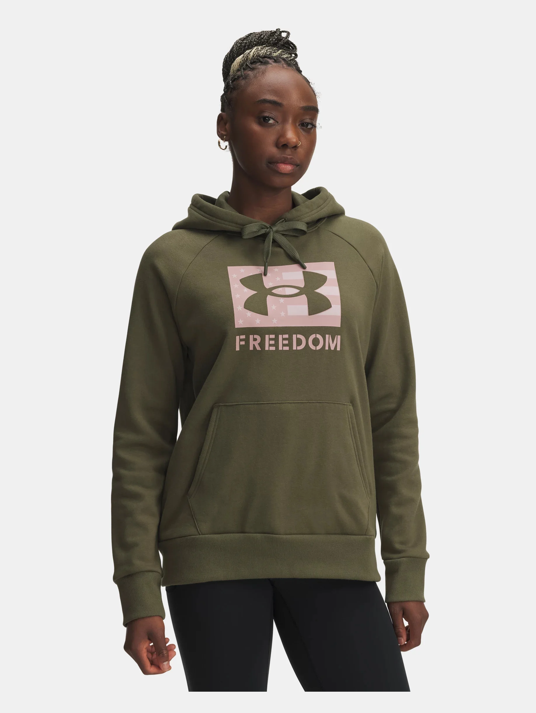 UA Freedom's goal is to support and inspire the brave men and women dedicated to protecting us, every day. This hoodie is light, comfy, and super-soft Product Details - Ultra-soft cotton-blend fleece with brushed inside for extra warmth - Front kangaroo pocket - Ribbed cuffs & bottom hem - Main body fabric engineered to reduce fiber shedding leveraging Under Armour's Fiber Shed Test Method Size & Fit - Fuller cut for complete comfort. Space & Care - Style #: 6007923 - 80% Cotton/20% Polyester - Imported