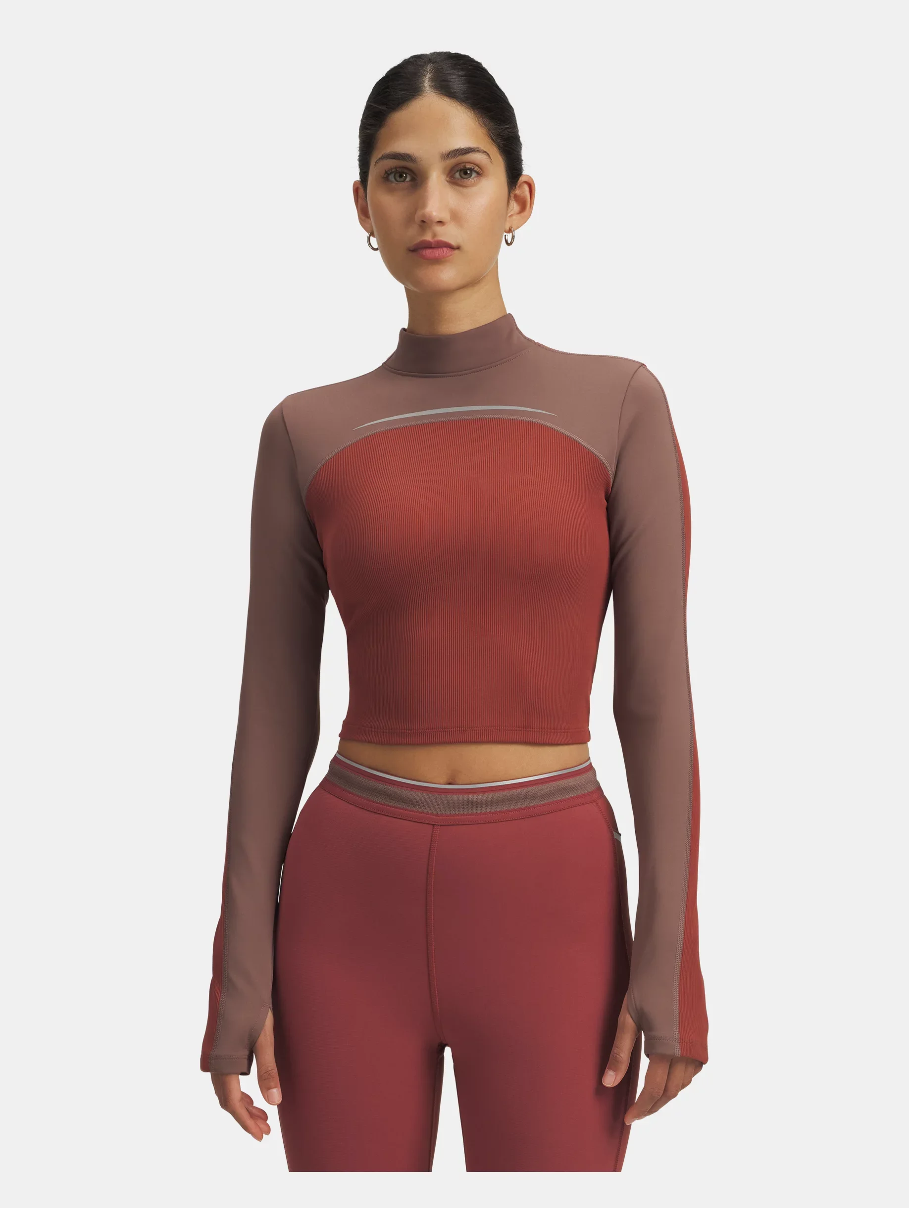 The Halo State:where form and function fall into lock step. Our new collection of gear is made in perfect synergy. A mock neck engineered to keep you warm and designed to move with you for ultimate performance and comfort. Product Details - Sport Activity Recommendation: HIIT, Interval Training, High Intensity Workouts, Lifting - Weather Conditions: Cold temperatures - Super-soft double knit fabric has a brushed interior for warmth with ribbed fabric on body & sleeve panels - Material wicks sweat & dries really fast - LYCRA® ADAPTIV fiber maintains softness even as it stretches for unparalleled comfort through every move - Mock neck collar for added coverage & warmth - Built-in thumbholes help keep sleeves in place Size & Fit - Streamlined fit that's not too tight or too loose. Space & Care - Style #: 6005980 - Reflective taping details - Upper Body: 73% Polyester/27% Elastane - Rib: 91% Nylon/9% Elastane - Imported - Machine wash cold with like colors - Do not bleach - Tumble dry low - Do not iron - Do not use softeners - Do not dry clean