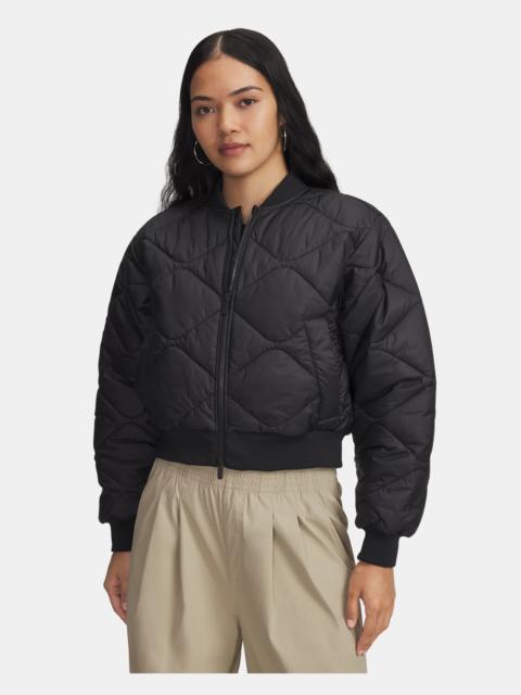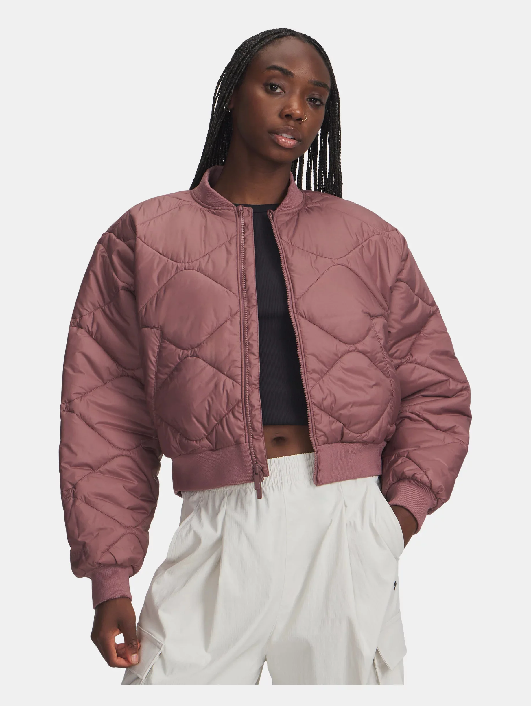 This bomber jacket gives you warmth without bulk, protection from the elements, and a classic, heritage look with an all-over quilted pattern. Product Details - UA Storm technology repels water without sacrificing breathability - Lightweight ripstop woven fabric with quilted pattern delivers superior comfort & durability - All-over 120g synthetic insulation for midweight warmth without any excess bulk - Ribbed collar, cuffs & bottom hem - Secure zip hand pockets - Main body fabric contains at least 90% recycled polyester, excluding trims & embellishments Size & Fit - Fuller cut for complete comfort. Space & Care - Style #: 6000638 - 100% Polyester - Imported