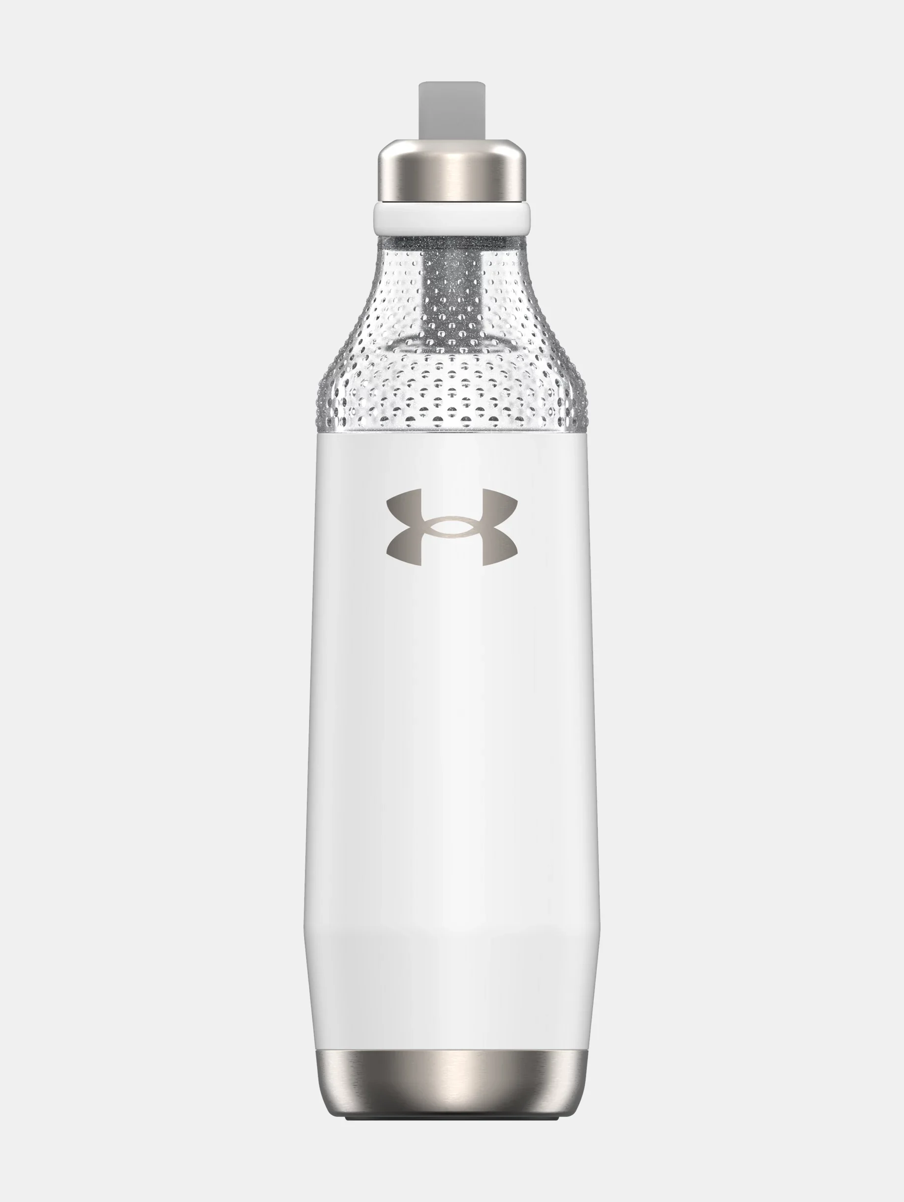 What's it do? A wide twist-off top lets you add ice or protein powder quickly and easily. Use as a vacuum-insulated water bottle during your workout and as a tumbler before or after. Product DNA - Twist-off Tritan™ top is shatter-, stain- & odor-resistant & converts bottle into 18 oz. tumbler - Stainless steel & vacuum-insulated for maximum temperature retention—keeps beverages cold for 12 hours - Non-slip silicone bottom provides quiet set-down on any surface - Carry loop for easy transport - Large opening for easy fill & cleaning with twist-to-seal lid that helps keep spout clean - BPA & lead free - One Size Fits All - Style #: 1372205 - Capacity: 22 oz. (bottle) or 18 oz. (tumbler) - Dimensions: 11.1"H x 3.15"W x 3.54"D - Manufactured by USB, exclusive licensee of Under Armour® - Imported
