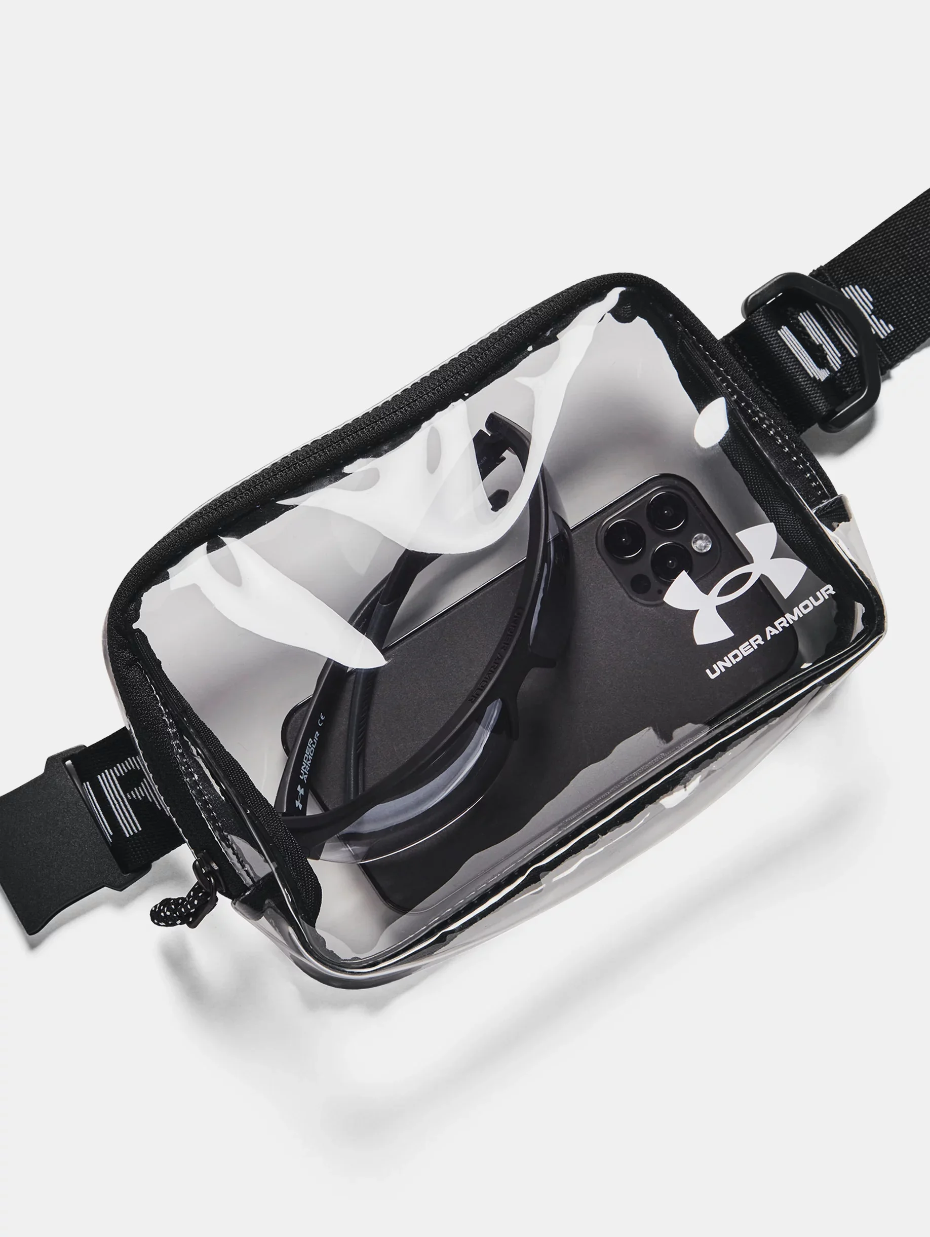 What's it do? The pockets are designed to give you quick access to the items you need the most, and you can wear it as a waist or crossbody bag. Product DNA - Fully transparent, water-resistant plastic material is lightweight & durable - Adjustable strap with buckle closure can be worn as a waist bag or a crossbody - Zippered main compartment - *UA Contain Micro attachment sold separately - One Size Fits Most - Style #: 1380479 - Dimensions When Full: 2"W x 5.1"H x 7.9"L - Volume: 2 L - 100% TPU - Imported