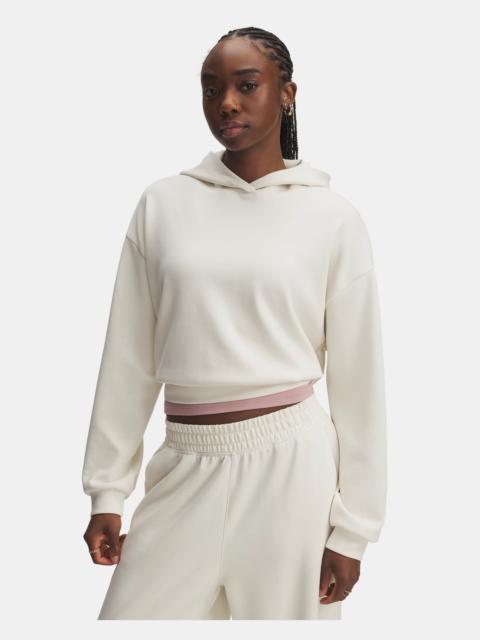 UA Meridian staples are not only ultra soft, they're also light, quick-drying, and designed to flatter your body. Updated with a relaxed fit and premium fabric—you'll literally wear this crewneck everywhere. Product Details - Super-soft, lux knit fabric with a sanded finish is ultra cozy - 4-way stretch material moves better in every direction - Drop hem shoulder & cropped body length Size & Fit - Fuller cut for complete comfort. Space & Care - Style #: 6004006 - 53% Polyester/37% Modal/10% Elastane - Imported