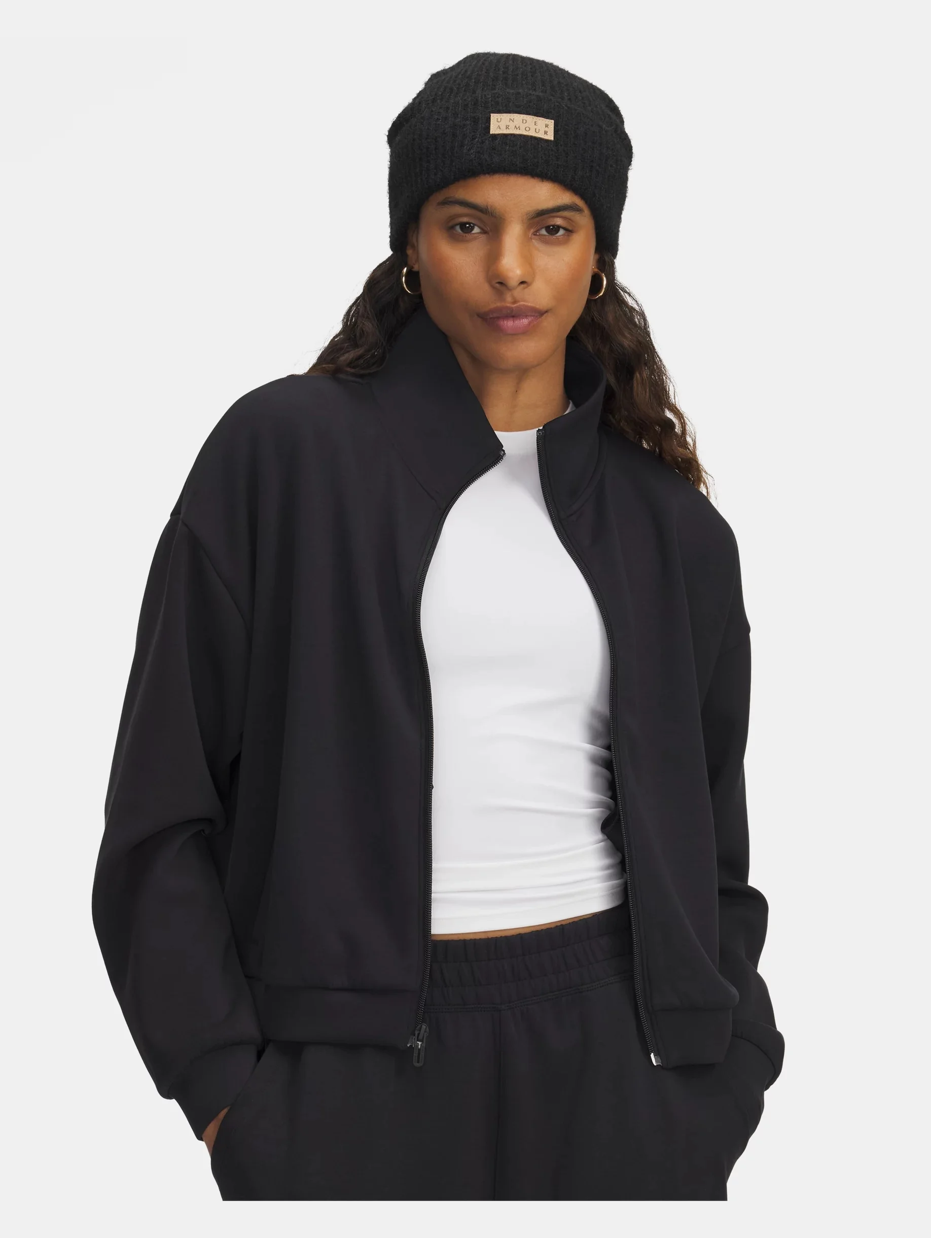 UA Meridian staples are not only ultra soft, they're also light, quick-drying, and designed to flatter your body. Updated with a relaxed fit and premium fabric—you'll literally wear this full zip everywhere. Product Details - Super-soft, lux knit fabric with a sanded finish is ultra cozy - 4-way stretch material moves better in every direction - Open hand pockets - Drop hem shoulder Size & Fit - Fuller cut for complete comfort. Space & Care - Style #: 6007963 - 53% Polyester/37% Modal/10% Elastane - Imported