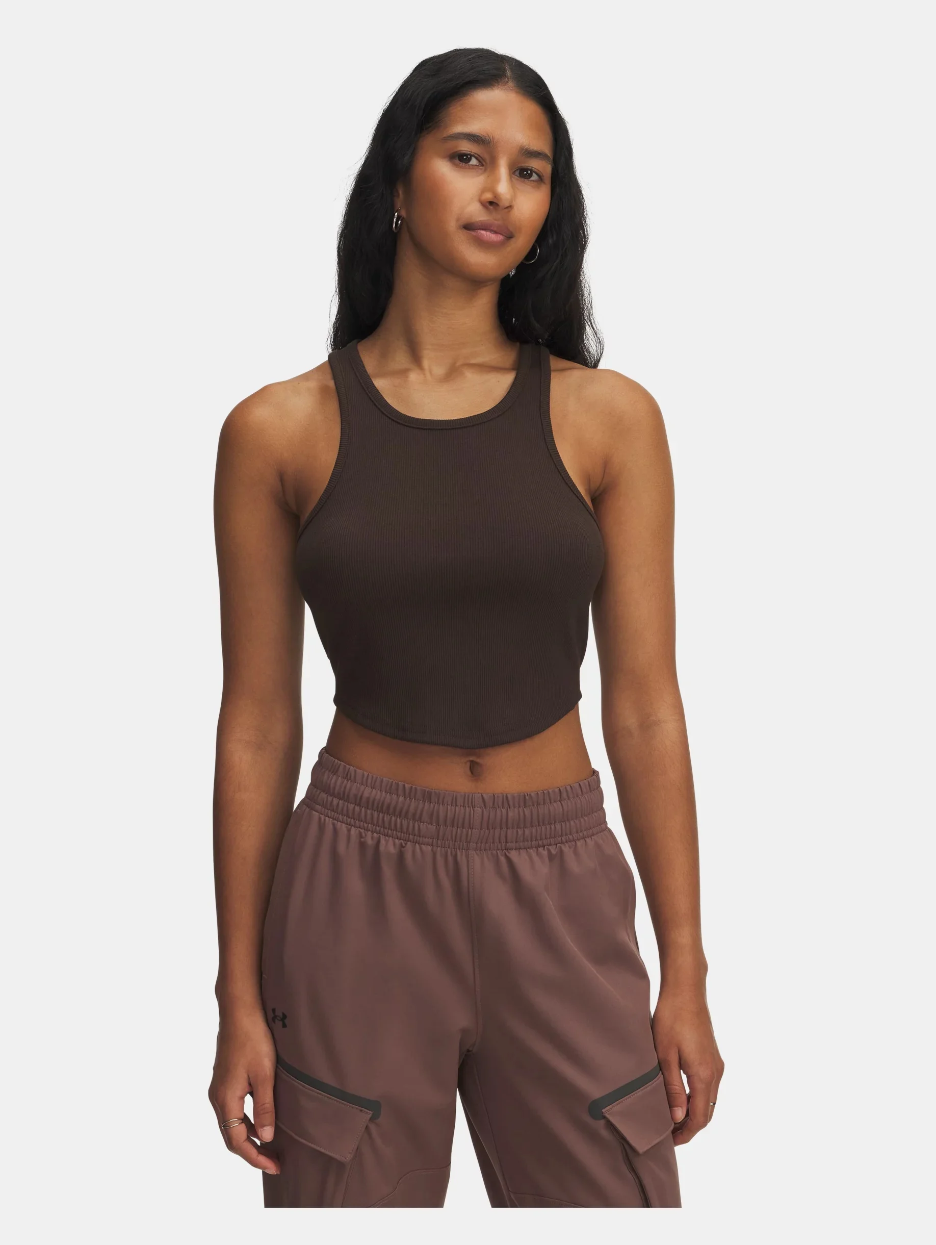 UA Rival Rib essentials are a must for every athlete.The classic ribbed fabric is soft and stretchy and the cropped fit with shaped hem makes for easy layering. Product Details - Soft ribbed fabric is lightweight & comfortable - 4-way stretch material moves better in every direction - Scoop neck & curved bottom hem - Cropped body length - Main body fabric contains at least 30% recycled polyester, excluding trims & embellishments Size & Fit - Streamlined fit that’s not too tight or too loose. Space & Care - Style #: 1389798 - 57% Cotton/38% Polyester/5% Elastane - Imported