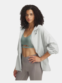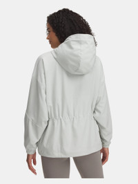 This woven jacket is the perfect lightweight layer.It's water-resistant, stretchy, and features a roomy, oversized fit with bungee waist cinch for a flattering look. Product Details - UA Storm technology repels water without sacrificing breathability - Lightweight stretch-woven fabric provides superior mobility & durability - 4-way stretch material moves better in every direction - Open hand pockets - Drop hem shoulder for an oversized look with interior bungee cinch at the waist for a custom fit - Encased elastic cuffs Size & Fit - Fuller cut for complete comfort. Space & Care - Style #: 6005515 - 87% Polyester/13% Elastane - Imported