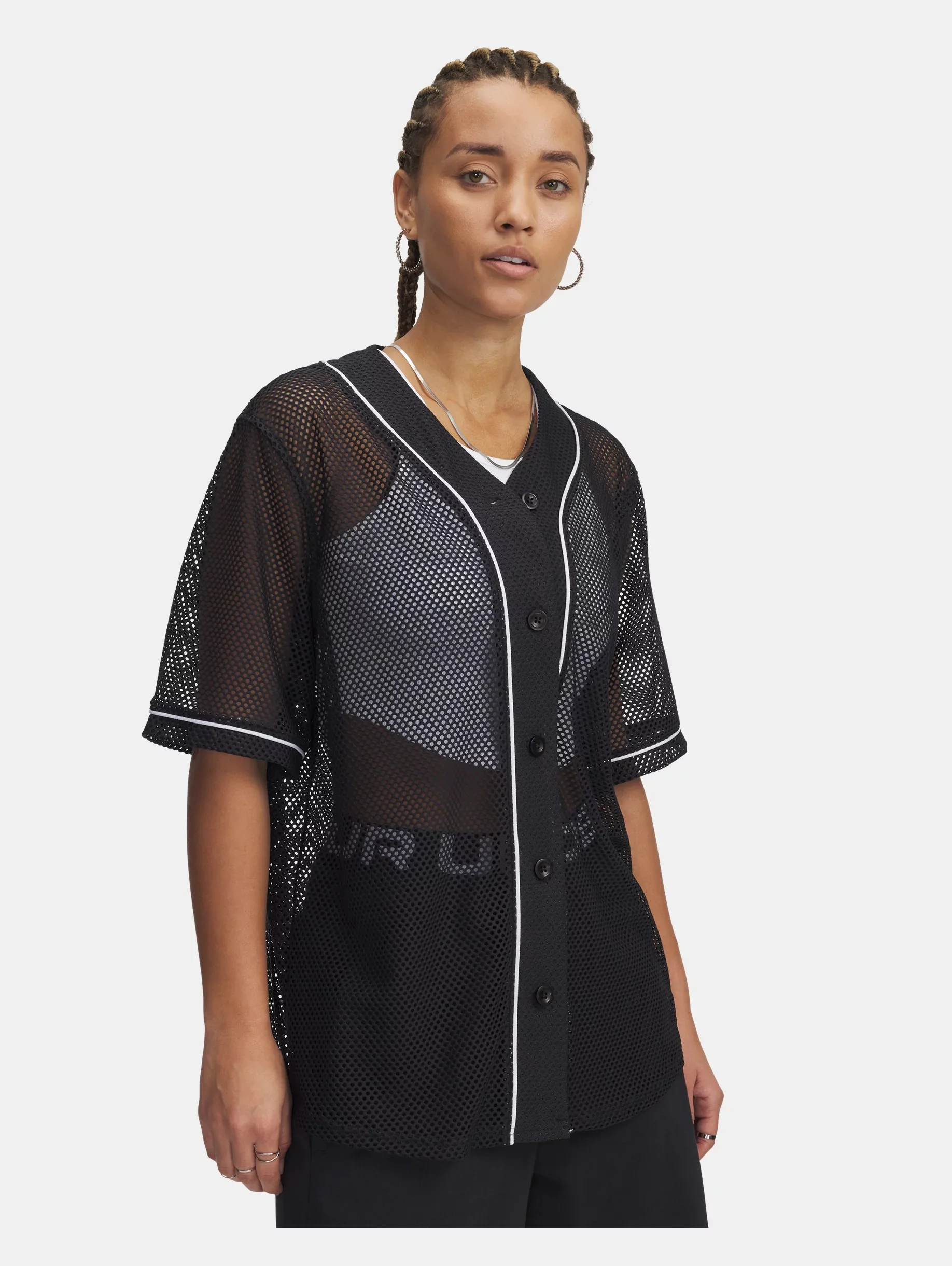 The breathable mesh fabric and relaxed fit makes these perfect for practice or game day. Product Details - Soft, open-hole mesh fabric is super-breathable & comfortable - Material wicks sweat & dries really fast - Front button-up placket - Shaped bottom hem Size & Fit - Fuller cut for complete comfort. Space & Care - Style #: 1389637 - 91% Polyester/9% Elastane - Imported