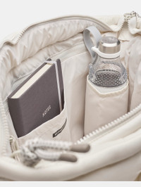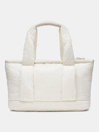It's tough, holds all your stuff, looks great, feels good on your shoulder, and has zipper pulls that double as hair ties. Product Details - Water-resistant UA Storm technology keeps your essentials dry - Smooth, durable puffer material for an elevated look & feel - Large zippered main compartment with dual corded zipper pulls & interior drop-in organization pocket - Front drop-in pocket for easy access to essentials - Uses a fluorine-free water repellent treatment Size & Fit - One Size Fits Most Space & Care - Style #: 6000963 - Dimensions When Full: 12.6"H x 23.2"W x 6.9"D - Volume: 23 L - Imported - 100% Nylon