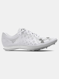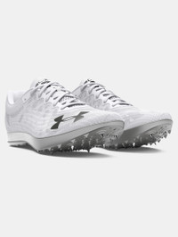 What's it do? Built to take on 1500M to 10K, these track spikes have crazy range. Bouncy, energy-returning foam, a full-length plate, grippy 6-pin spikes, and the locked-in fit of a UA Warp upper will help you hit PRs this race season. Product DNA - Warp™ upper optimizes containment with lightweight lockdown & allows maximum breathability - Midsole geometry gets you up on your toes quicker for more momentum & faster turnover - Full-length plate provides rigidity & a solid platform for energized liftoffs - Increased midsole foam in the forefoot compresses & springs back for added lift & energy return - 6-pin spike design in forefoot for enhanced grip on the track - Regular - Style #: 3027959 - 6-pin forefoot - Weight: 5.8 oz. - Lace type: Standard tie - Imported
