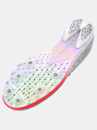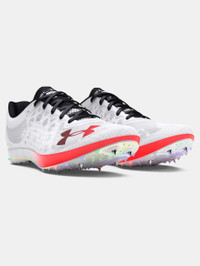 What's it do? Built to take on 1500M to 10K, these track spikes have crazy range. Bouncy, energy-returning foam, a full-length plate, grippy 6-pin spikes, and the locked-in fit of a UA Warp upper will help you hit PRs this race season. Product DNA - Warp™ upper optimizes containment with lightweight lockdown & allows maximum breathability - Midsole geometry gets you up on your toes quicker for more momentum & faster turnover - Full-length plate provides rigidity & a solid platform for energized liftoffs - Increased midsole foam in the forefoot compresses & springs back for added lift & energy return - 6-pin spike design in forefoot for enhanced grip on the track - Regular - Style #: 3027959 - 6-pin forefoot - Weight: 5.8 oz. - Lace type: Standard tie - Imported