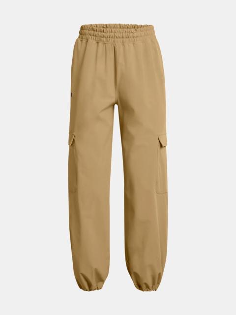 What's it do? The goal with the UA Woven collection was to make the perfect set of warm-ups that keep your muscles ready, work for any sport, and also pack up super-small in your bag, so you can take them anywhere. Product DNA - UA Storm technology repels water without sacrificing breathability - Ultra-light, stretch-woven fabric for totally unrestricted movement - 4-way stretch material moves better in every direction - UPF 50+ protects your skin from the sun's harmful rays - Encased elastic waistband with internal drawcord - Open hand pockets & flap-closure cargo pockets - Bungee adjust bottom hem so you can wear cinched for a more secure fit or uncinched for a looser feel - Uses a fluorine-free water repellent treatment - Loose: Fuller cut for complete comfort. - Style #: 1382696 - Inseam: 27.5" - Pockets: Yes - 87% Polyester/13% Elastane - Imported