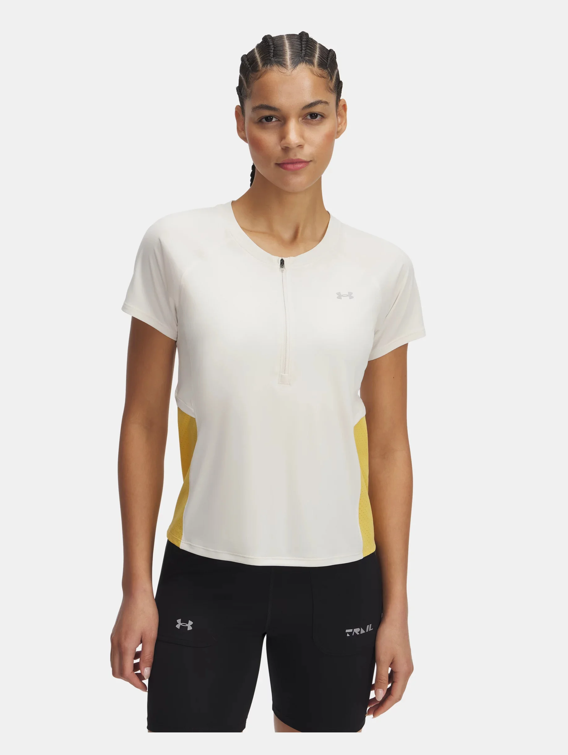 What's it do? A running shirt designed specifically for the hazards of the trail. Light, ultra-durable, stretchy, quick-drying, and features a front zip for quick ventilation. No trail is too tough. Product DNA - Lightweight, stretchy knit fabric with UPF 40 protection on front body for all-day comfort on the trails - Perforated, stretch-woven fabric on back & sides for added durability & breathability - Material wicks sweat & dries really fast - Overlapped vent at underarms, perforated side panels & ½ zip front for greater airflow - Interior bungee loop on collar for easy hang up - Raglan sleeves - Loose: Fuller cut for complete comfort. - Style #: 1389607 - Reflective details for low-light runs - Front Body: 100% Polyester - Back & Side Panels: 88% Polyester/12 Elastane - Imported
