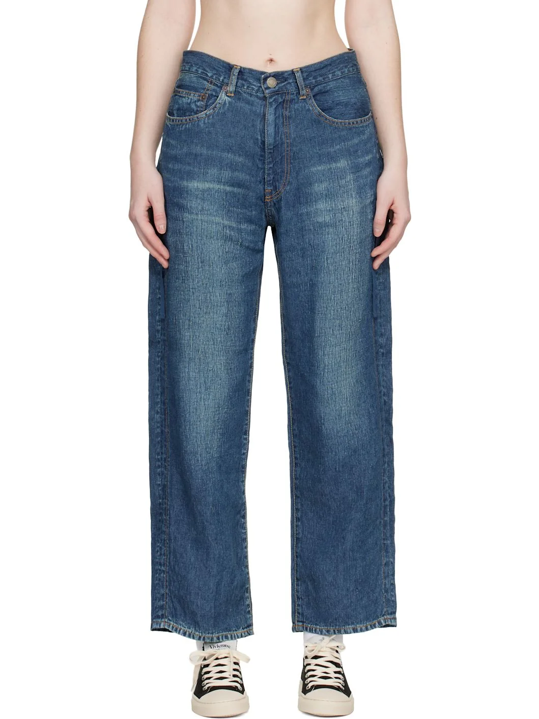 Linen denim jeans. · Fading and whiskering throughout · Straight-leg · Belt loops · Five-pocket styling · Zip fly · Adjustable cinch straps at outseam · Contrast stitching in tan Supplier color: Indigo 100% linen. Made in Japan 261414F069002