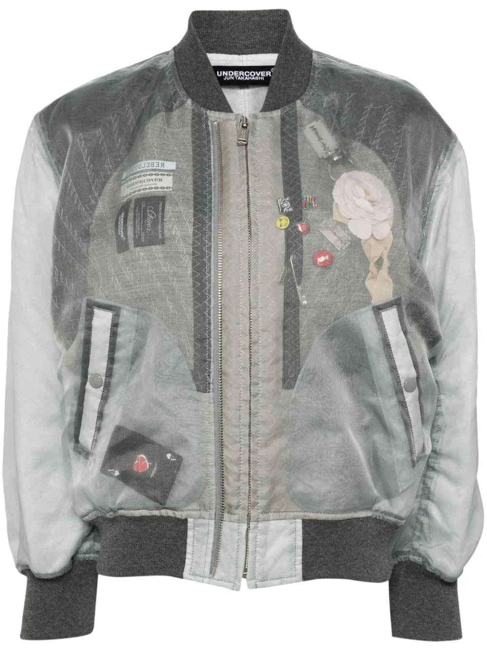 floral-applique layered bomber jacket Highlights - Ice blue/dark grey - Silk - Layered design - Semi-sheer construction - Applique logo - Floral applique - Safety pin detail - Decorative zip detailing - Baseball collar - Front zip fastening - Drop shoulder - Long sleeves - Ribbed cuffs and hem - Two side welt pockets Imported Composition Silk 100% Washing instructions Dry Clean Only