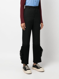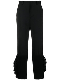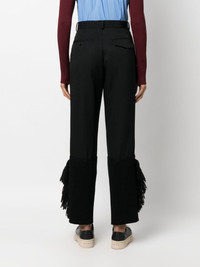 frayed-trim cropped trousers Highlights - Black - Wool - Bemberg™ cupro - Knitted panels - Frayed detailing - High waist - Belt loops - Concealed front fastening - Straight leg - Cropped - Two side inset pockets - Rear button-fastening jetted pocket - Rear flap pocket Imported Composition Outer: Wool 100% Lining: Cupro 100% SIZE & FIT Model measurements Height 5 ft 10 in(1.78 m) Bust/Chest 33.07 in(84 cm) Hips 36.61 in(93 cm) Waist 24.8 in(63 cm) FittingInformation Designed for a tapered fit, these trousers allow for a close fit at the waist and a loose unrestricted fit over the leg with a closer fit towards the ankle Made from a midweight non-stretch fabric This piece fits true to size – take your usual size Washing instructions Dry Clean Only