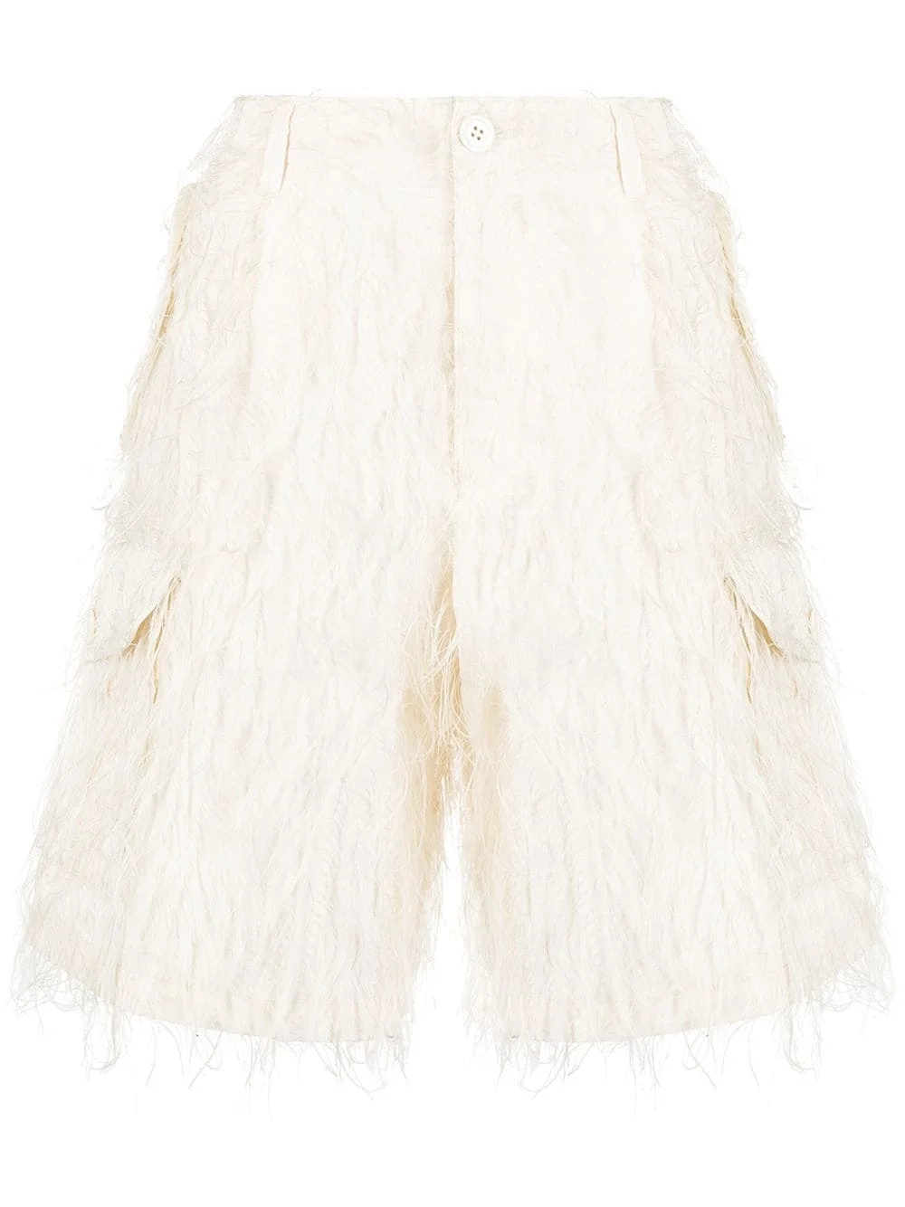 fringed cargo shorts Undercover is a Japanese clothing brand founded by Jun Takahashi in 1993 influenced by street culture. Following the brand's casual aesthetic, these cargo shorts follow a classic silhouette and are updated with tonal fringe detailing. Imported Composition Outer: Polyester 56%, Cotton 44% Lining: Polyester 100% SIZE & FIT Model measurements Height 5 ft 10 in(1.78 m) Bust/Chest 30.31 in(77 cm) Hips 34.64 in(88 cm) Waist 25.59 in(65 cm) FittingInformation This piece fits true to size. We recommend you get your regular size Designed to be fitted at the waist, loose over the leg Made with a mid-weight non-stretch fabric