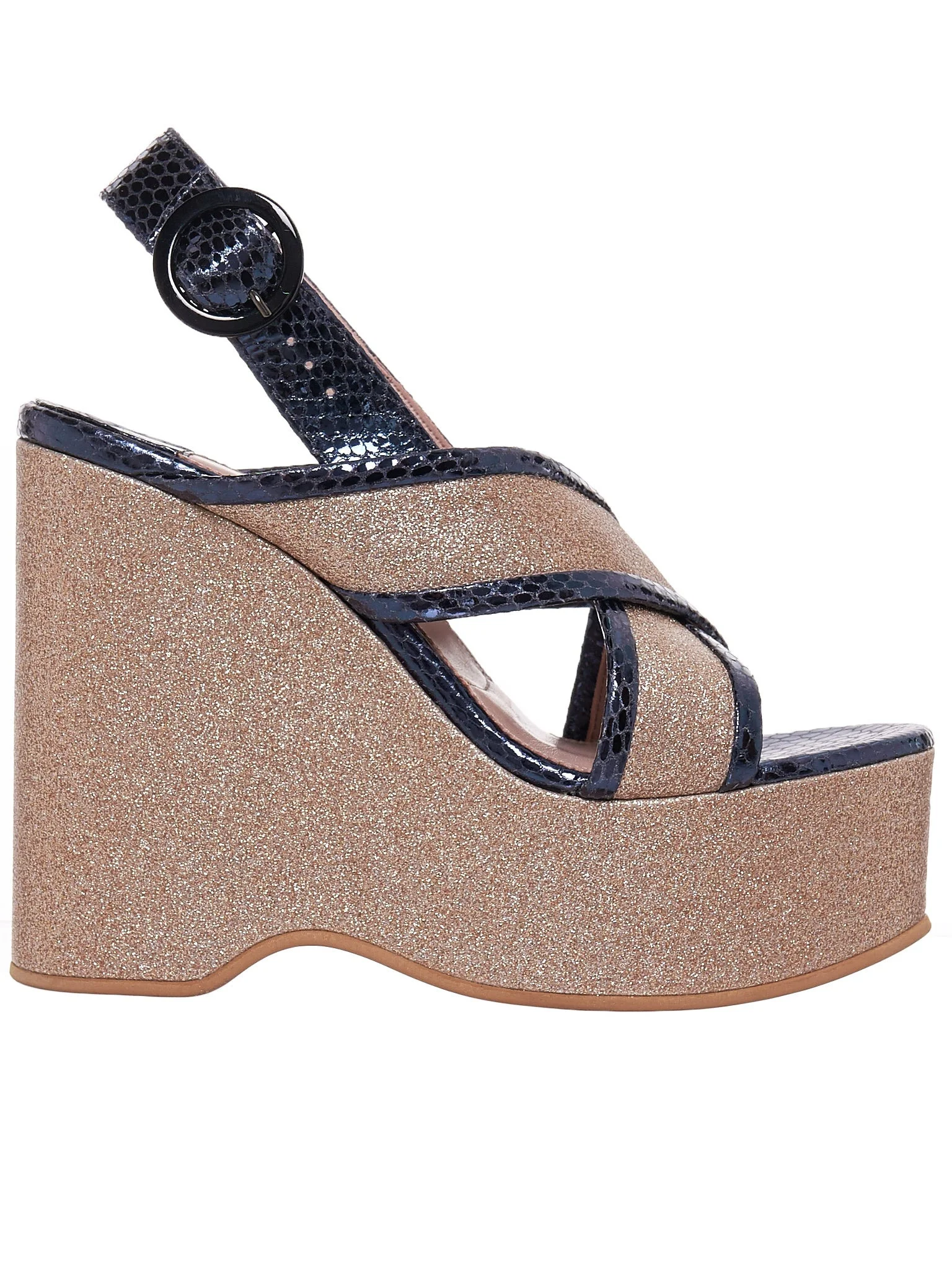 Undercover wedge sandal in gold/navy, platform heel, leather footbed and heel strap, leather piping along foot straps, rubber sole piece, tonal stitching. Made in Japan. Composition - 50% Polyester, 33% Polyurethane, 17% Cotton; 100% Leather (Belt); 100% Rubber (Sole)