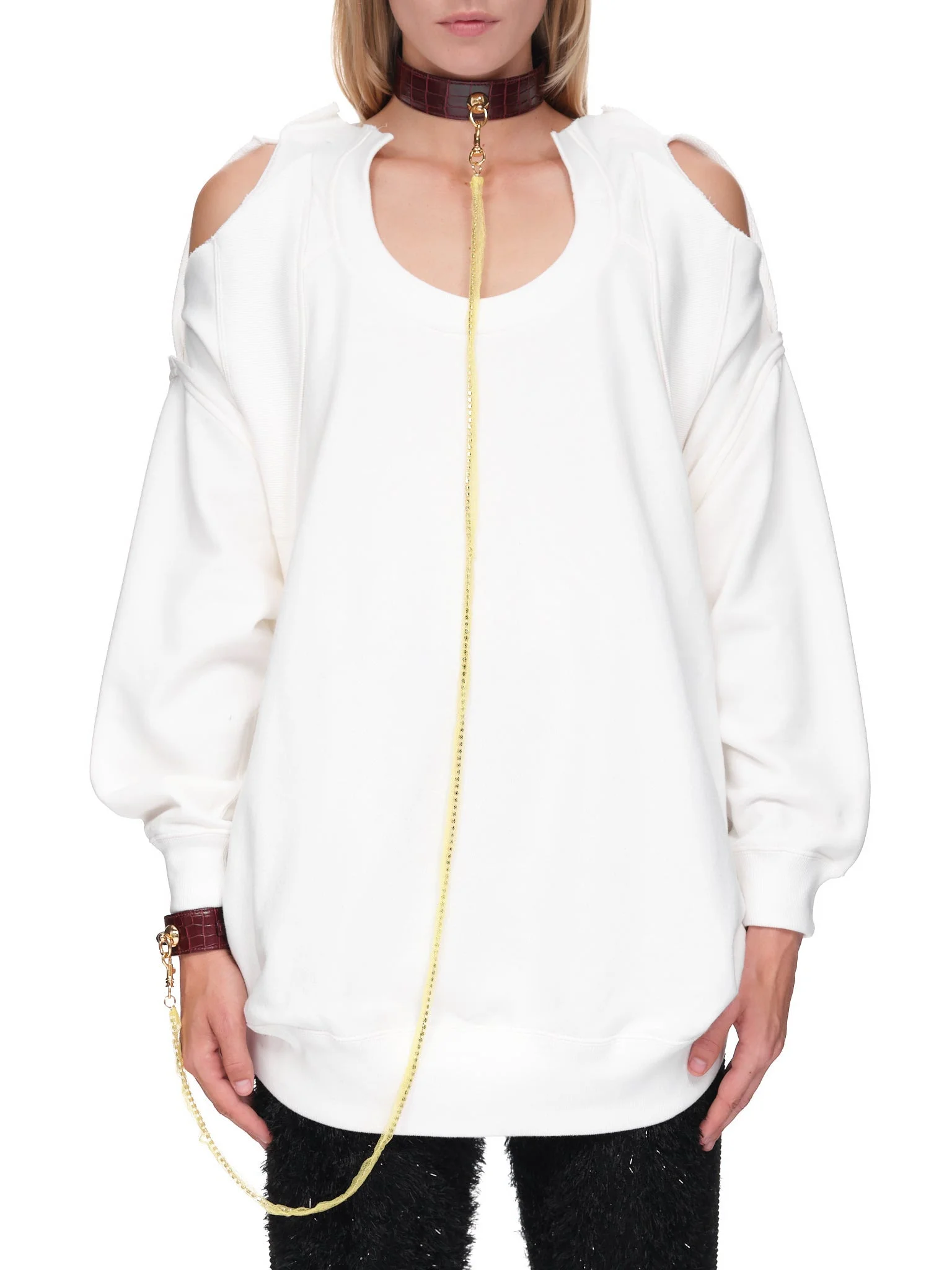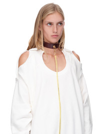 Undercover choker in brown, adjustable back buckle, cuff and chain attachment, gold-tone hardware, crocodile embossed leather. Made in Japan. One Size.
