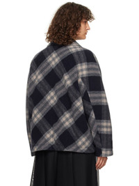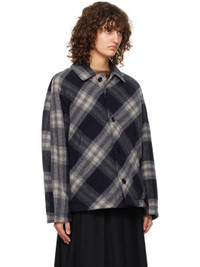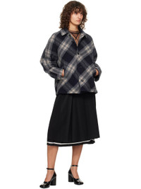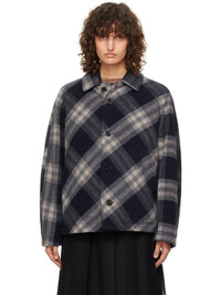 Padded brushed wool-blend flannel jacket. Check pattern throughout. · Spread collar · Button closure · Welt pockets · Raglan sleeves · Welt pockets at interior · Full satin lining Supplier color: Navy check Body: 60% wool, 30% polyester, 4% acrylic, 3% rayon, 3% nylon. Fill: 100% polyester. Lining: 100% cupro. Made in Japan 242414F063001