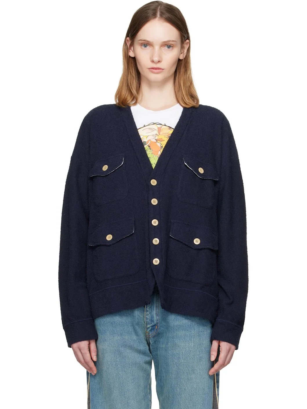 Cotton-blend flannel cardigan. · V-neck · Button closure · Flap pockets at front · Full flannel lining Supplier color: Navy Body: 85% cotton, 15% polyester. Lining: 100% cotton. Made in Japan 252414F095000