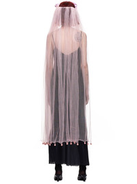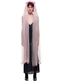 Undercover tulle tiara train in light pink, all over sheer/chiffon fine mesh fabric design, metallic wire headband with sculpted accents, 3D fabric ball fringe accents, tonal stitching. Made in Japan. Composition - 100% Silk Model Measurements: Model is 5ft 8” and wearing a One Size. Bust: 32” Waist: 23” Hip: 32”