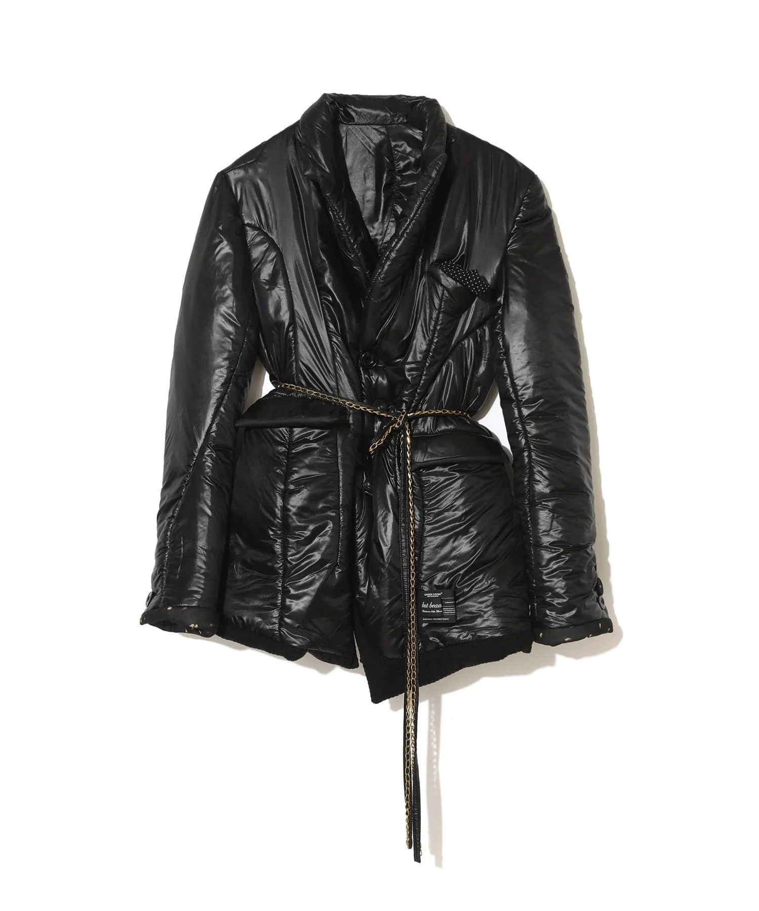 - Padded nylon jacket - Front flap pockets - Back tag - Chain belt MATERIAL 100% NYLON PARTLY1: 100% SILK PARTLY2: 100% POLYESTER PARTLY3: 100% SILK FILLING: 100% POLYESTER LINING: 100% NYLON