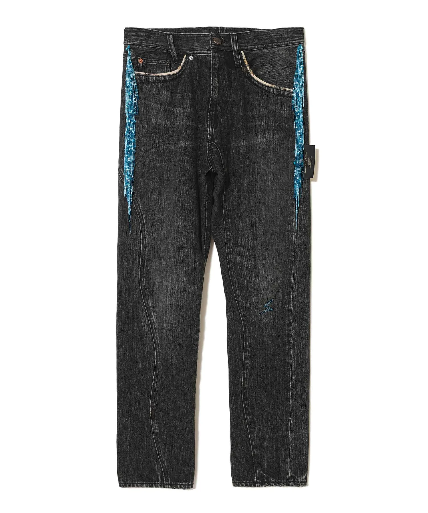 - Distressed jeans - Beaded fringe and tag on the side - Beaded embroidery on the front - Patch pocket and patch on the back MATERIAL 100% COTTON PARTLY: 100% COTTON FILLING: 100% POLYESTER