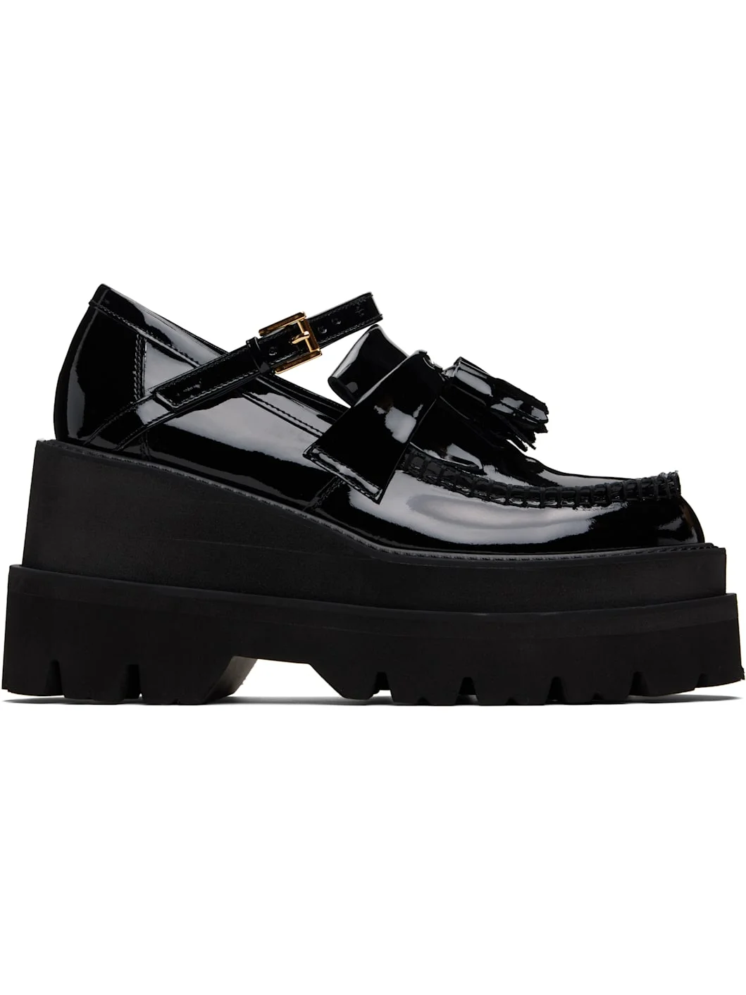 Patent leather loafers. · Moc toe · Strap and tassels at vamp · Adjustable pin-buckle strap at vamp · Grained leather lining · Foam rubber platform midsole · Treaded rubber sole · Platform: H2.25" · Heel: H3.5" Supplier color: Black Upper: leather. Sole: rubber. Made in Japan 252414F121000