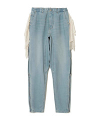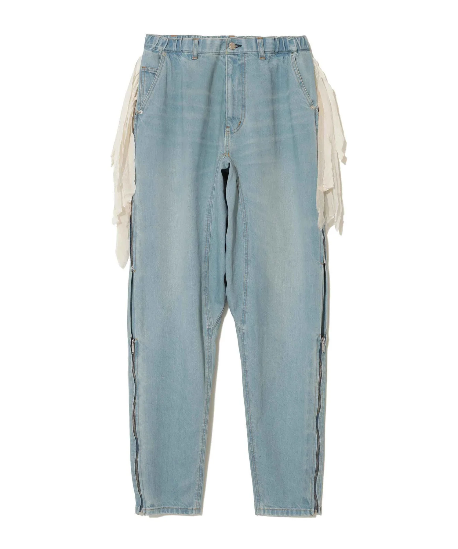 -Textured denim pants -Side zipper -Chiffon fringe on the sides -Elastic waist -Back patch pocket MATERIAL 100% COTTON PARTLY: 75% POLYESTER, 10% COTTON, 10% RAYON, 5% LINEN