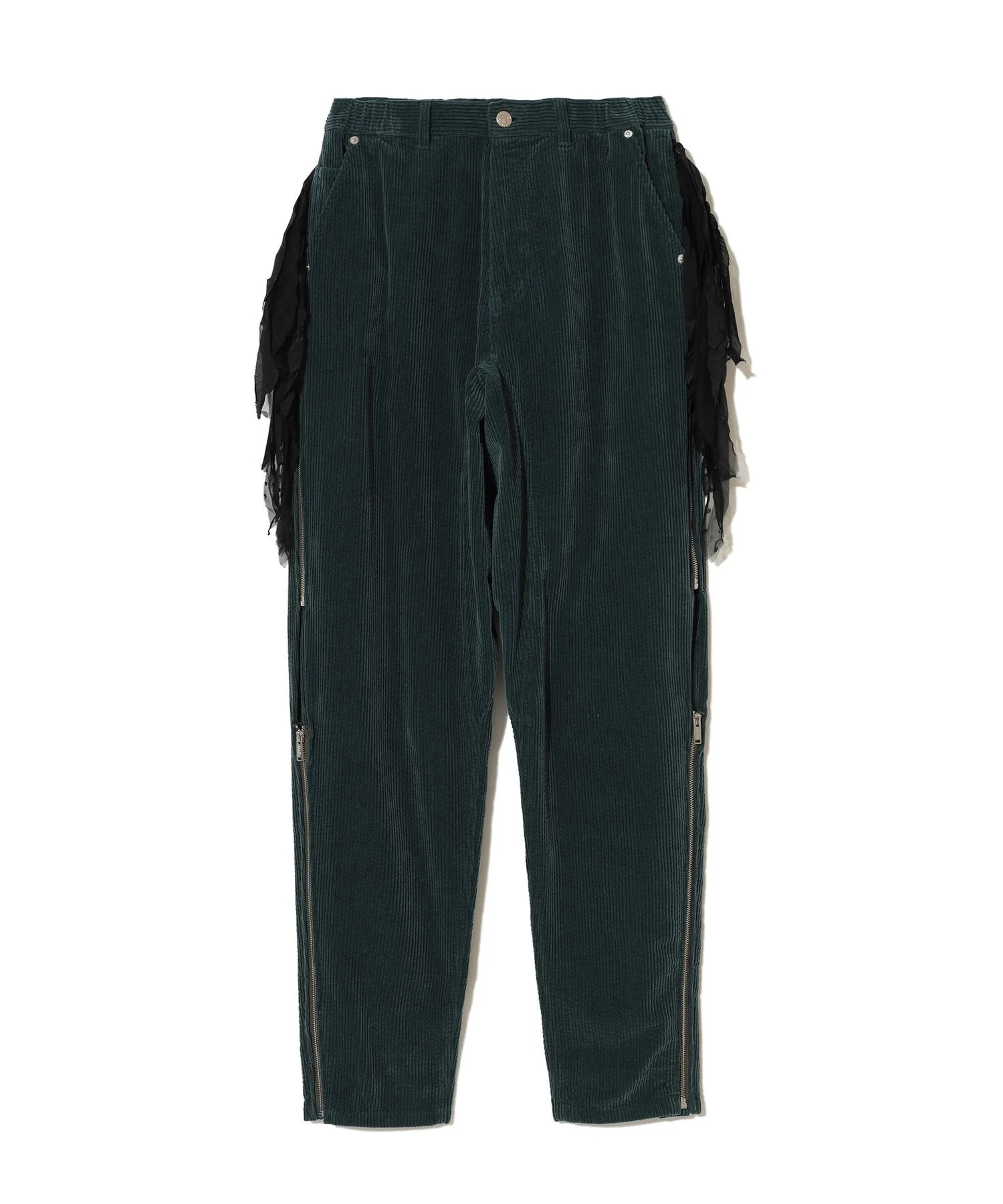 -Cotton corduroy pants -Side zipper -Chiffon fringe on the sides -Elastic waist -Back patch pocket MATERIAL 100% COTTON PARTLY: 75% POLYESTER, 10% COTTON, 10% RAYON 5% LINEN