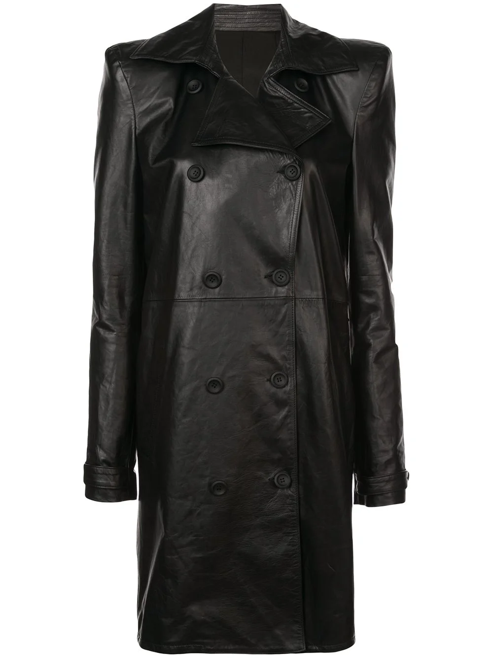 double breasted coat Black leather double breasted coat from Unravel. Imported Composition Calf Leather 100% SIZE & FIT Model measurements Height 5 ft 10 in(1.79 m) Bust/Chest 31.1 in(79 cm) Hips 33.85 in(86 cm) Waist 22.83 in(58 cm) Washing instructions Specialist Cleaning