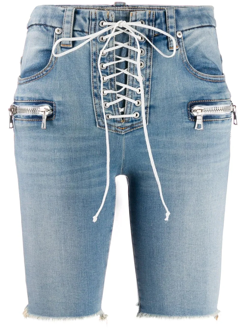 lace-up denim shorts Going for a walk in the city? Make sure you'll be at your best with these lace-up denim shorts from Unravel Project. Designed with a super skinny fit, they'll always guarantee a super sexy look. Work it, girl. Featuring a stonewashed effect, frayed edges, a high rise, a lace-up front fastening, a waistband with belt loops, two front pockets, front zipped pockets, rear pockets and a fitted silhouette. Made in Italy Composition Outer: Cotton 92%, Polyester 6%, Spandex/Elastane 2% Lining: Polyester 65%, Cotton 35% SIZE & FIT Model measurements Height 5 ft 10 in(1.77 m) Bust/Chest 35.03 in(89 cm) Hips 36.22 in(92 cm) Waist 25.98 in(66 cm) Washing instructions Hand Wash