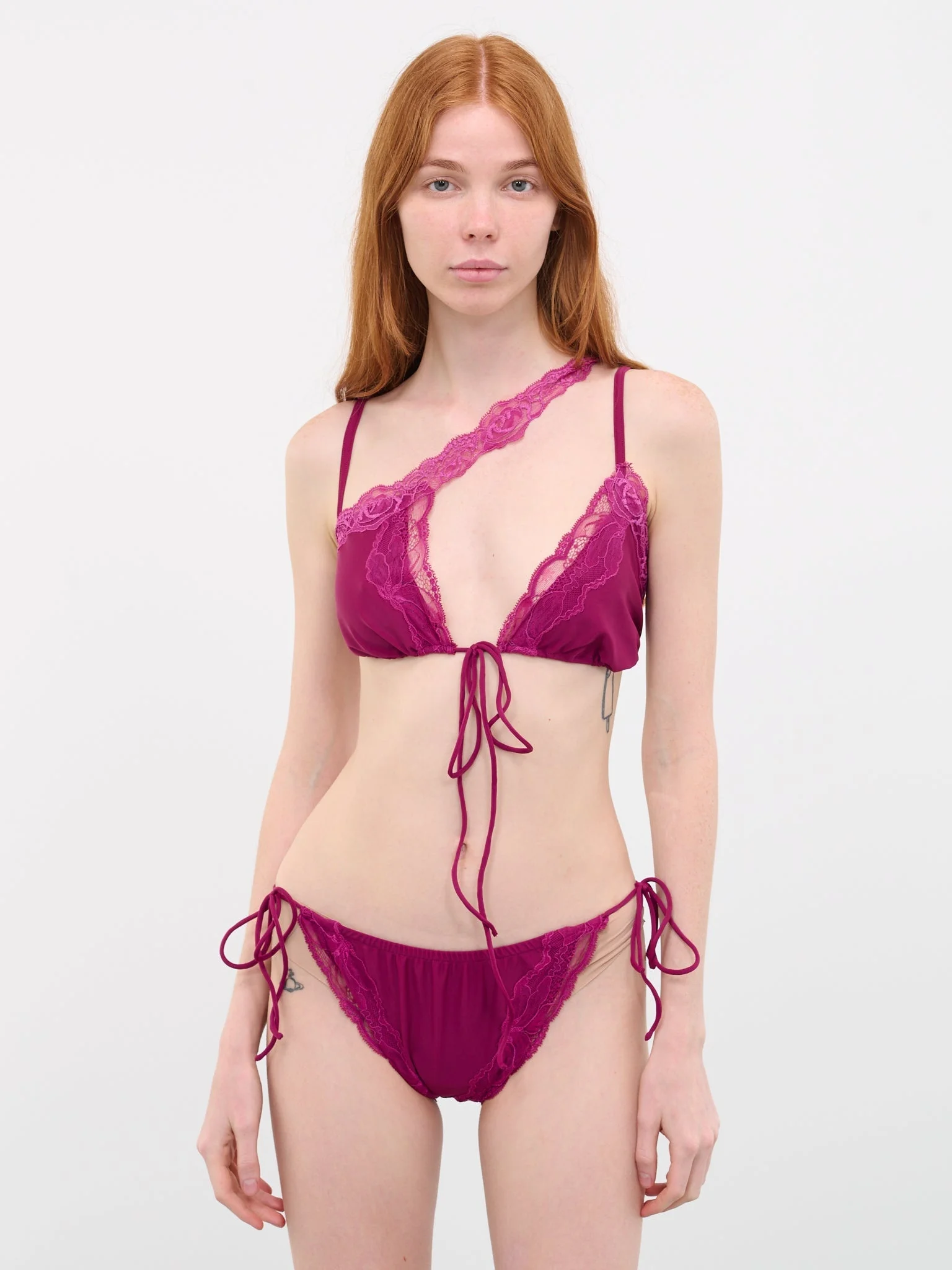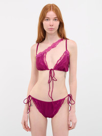 VAILLANT bikini top in pink, swim design, asymmetric straps, lace detailing, deep v-neck, center self-tie straps, fitted. Made in France Italian Sizing 80% Polyamide, 20% Elastane Model is 5'9" wearing size 36. Bust: 31.5" Waist: 23" Hips: 34"