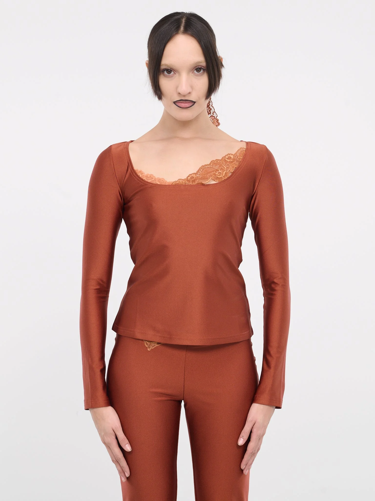 VAILLANT top in orange, asymmetric design, paneled lycra construction, asymmetric wide neck & lace trim, long sleeves, straight hem, slim fit. Made in Poland 80% Polyamide 20% Elastane European Sizing Model is 5'8" wearing size 36. Bust: 32" Waist: 26" Hips: 34.5"