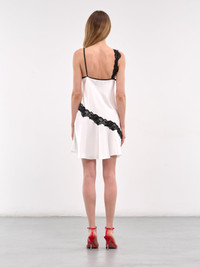 VAILLANT dress in white & black, paneled satin construction, asymmetric lace trim throughout, asymmetric v-neckline, mismatched shoulder straps, sleeveless, armscyes, partially open back, asymmetric ruffled hem, mini-length, relaxed fit. Made in France 100% Polyester French Sizing Model is 5'9" wearing size 36. Bust: 32" Waist: 23" Hips: 34"