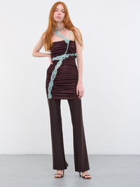 VAILLANT dress in brown blue, ruched bustier design, lace detailing, straight neckline, asymmetric straps, mini length, fitted. Made in Poland Italian Sizing 100% Viscose Model is 5'9" wearing size 36. Bust: 31.5" Waist: 23" Hips: 34"