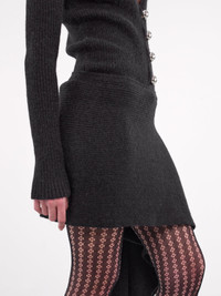 VAILLANT skirt in black, alpaca-nylon blend, paneled knit construction, rib-knit, side button closure, side extended knit scarf draping, asymmetric hem, mini-length, slim fit. Made in Turkey 77% Baby Alpaca 23% Polyamide French Sizing Model is 5'8" wearing size 36. Bust: 31" Waist: 23.5" Hips: 34"