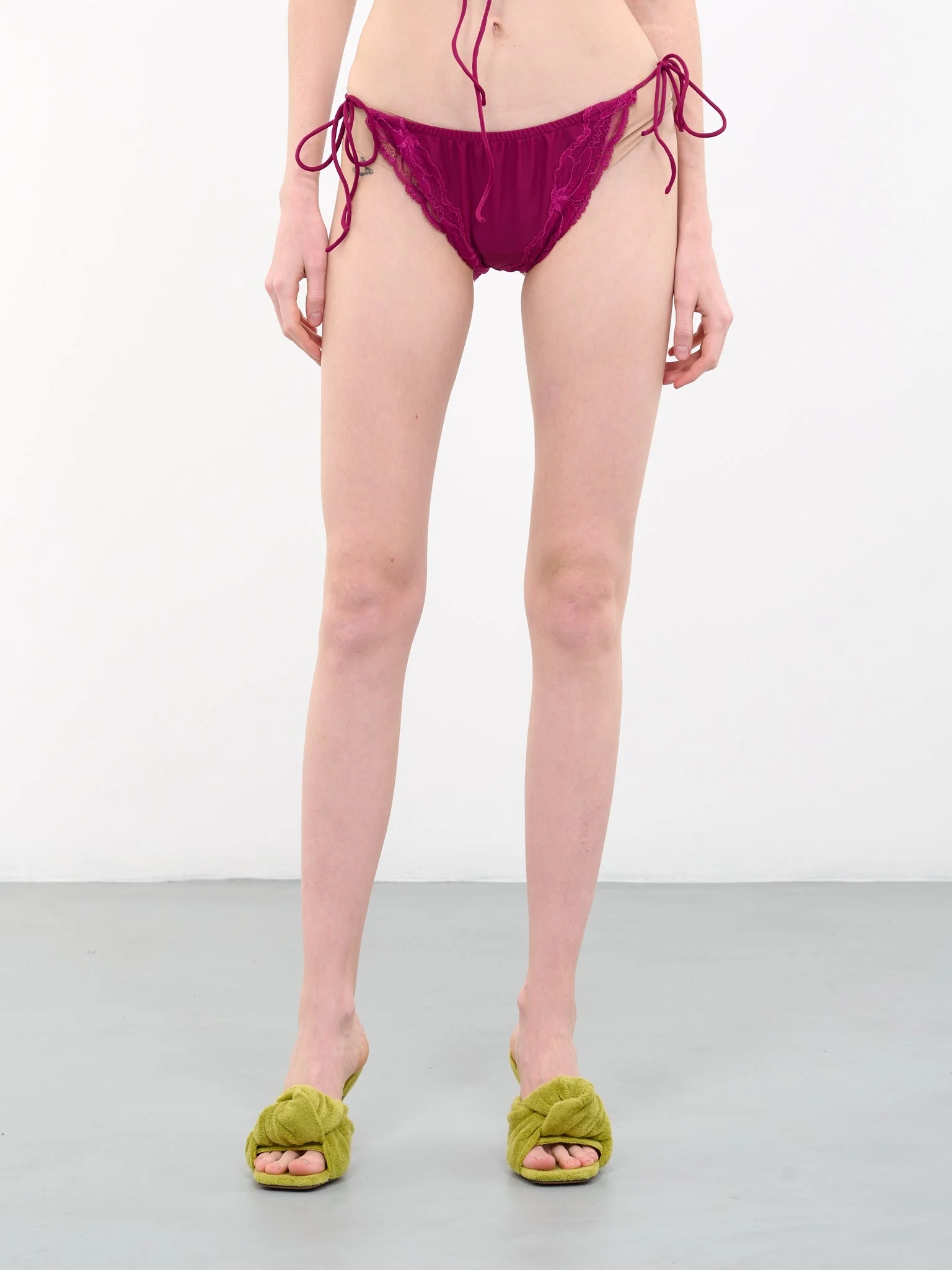 VAILLANT bikini bottom in pink, swim design, lace detailing, high-waist, self-tie straps, fitted. Made in France Italian Sizing 80% Polyamide, 20% Elastane Model is 5'9" wearing size 36. Bust: 31.5" Waist: 23" Hips: 34"