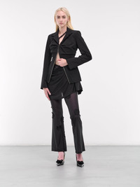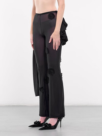 VAILLANT leggings in black, paneled mesh construction, semi-sheer, high waist, side ruched jupette skirt & lace patches, extended draping, flared leg, slim fit. Made in Poland 90% Polyamide 10% Elastane Model is 5'11" wearing size 36. Bust: 31.5" Waist: 25" Hips: 36"