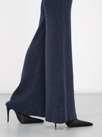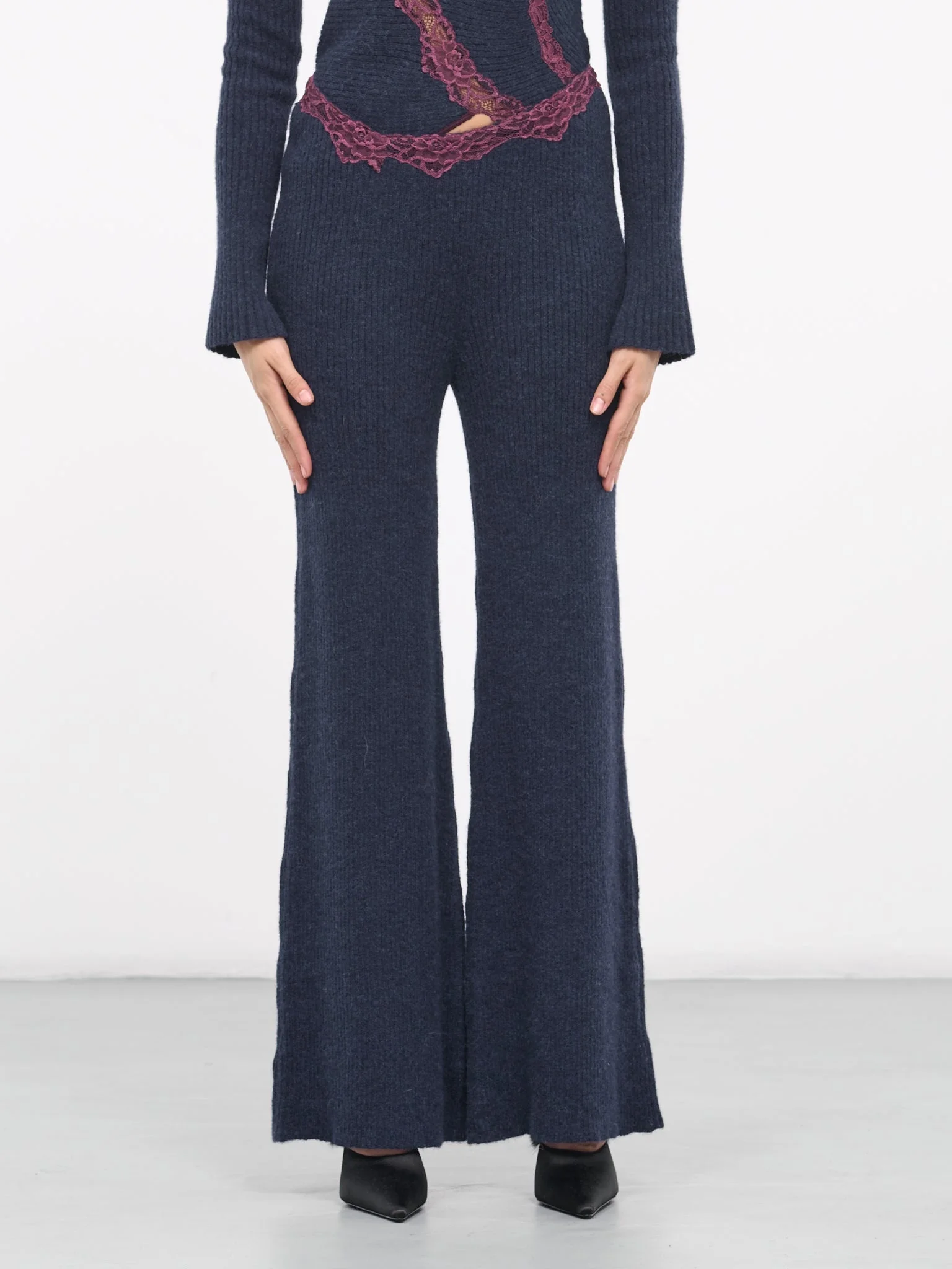 VAILLANT navy pants, signature lace design, rib knit construction, asymmetric lace trim waistband, flared leg, slim fit. French Sizing Model is 5'8" wearing size 36. Bust: 32" Waist: 26" Hips: 34.5"