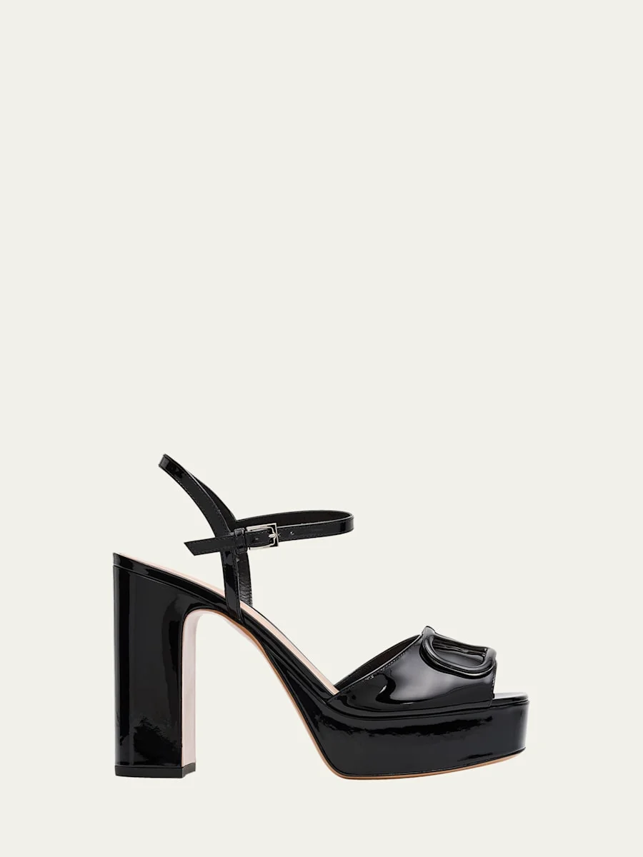 Valentino Garavani platform sandals in patent leather with tonal VLogo hardware 4.50 in / 115 mm block heel; 1.00 in / 25 mm platform Open toe Wide band upper Adjustable ankle strap Leather lining and sole Made in Italy