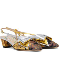 Grained leather and brocade heels in silver tone, gold tone, and black. · Jacquard pattern throughout · Bow accent at vamp · Pin-buckle slingback strap · Covered block heel with rubber injection · Logo hardware at heel · Leather sole · Heel: H1.75" Supplier color: Jacquard multi Upper: leather, textile. Sole: leather, rubber. Made in Italy 251807F122019