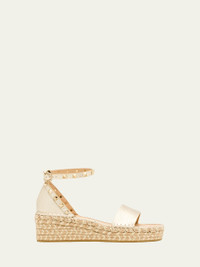 Accented with signature Rockstud trim, these espadrille sandals by Valentino Garavani are crafted from metallic calf leather atop a braided jute heel 2.25 in / 55 mm wedge heel; 1.00 in / 25 mm platform Open toe Single band vamp Adjustable ankle strap Leather lining Lightweight, sturdy TPU outsole Made in Italy Online Inquiries: BGS21_X7CQE| Store Inquiries: #5373951