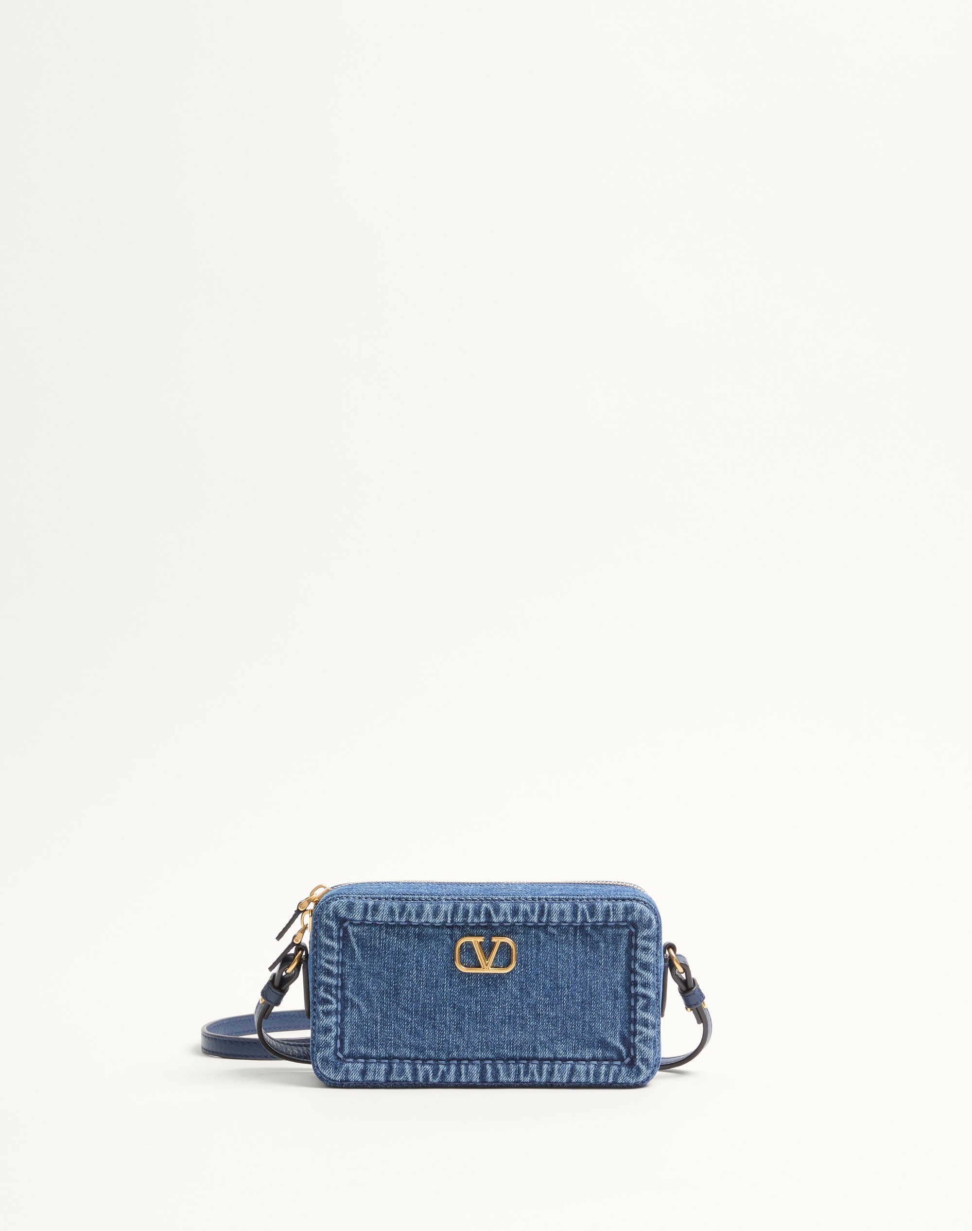 Valentino Garavani Alltime mini denim shoulder bag Can be worn on the shoulder/crossbody thanks to the adjustable leather shoulder strap. - Logo and hardware with antique brass finish - Zipper closure - Adjustable leather shoulder strap. Drop length: 53 cm / 20.8 in. - Canvas lining. Interior: one card slot - Dimensions: W19xH10xD4.5 cm / W7.5xH3.9xD1.8 in. - Made in Italy Product code: 6W2P0AI5JXE_YHS