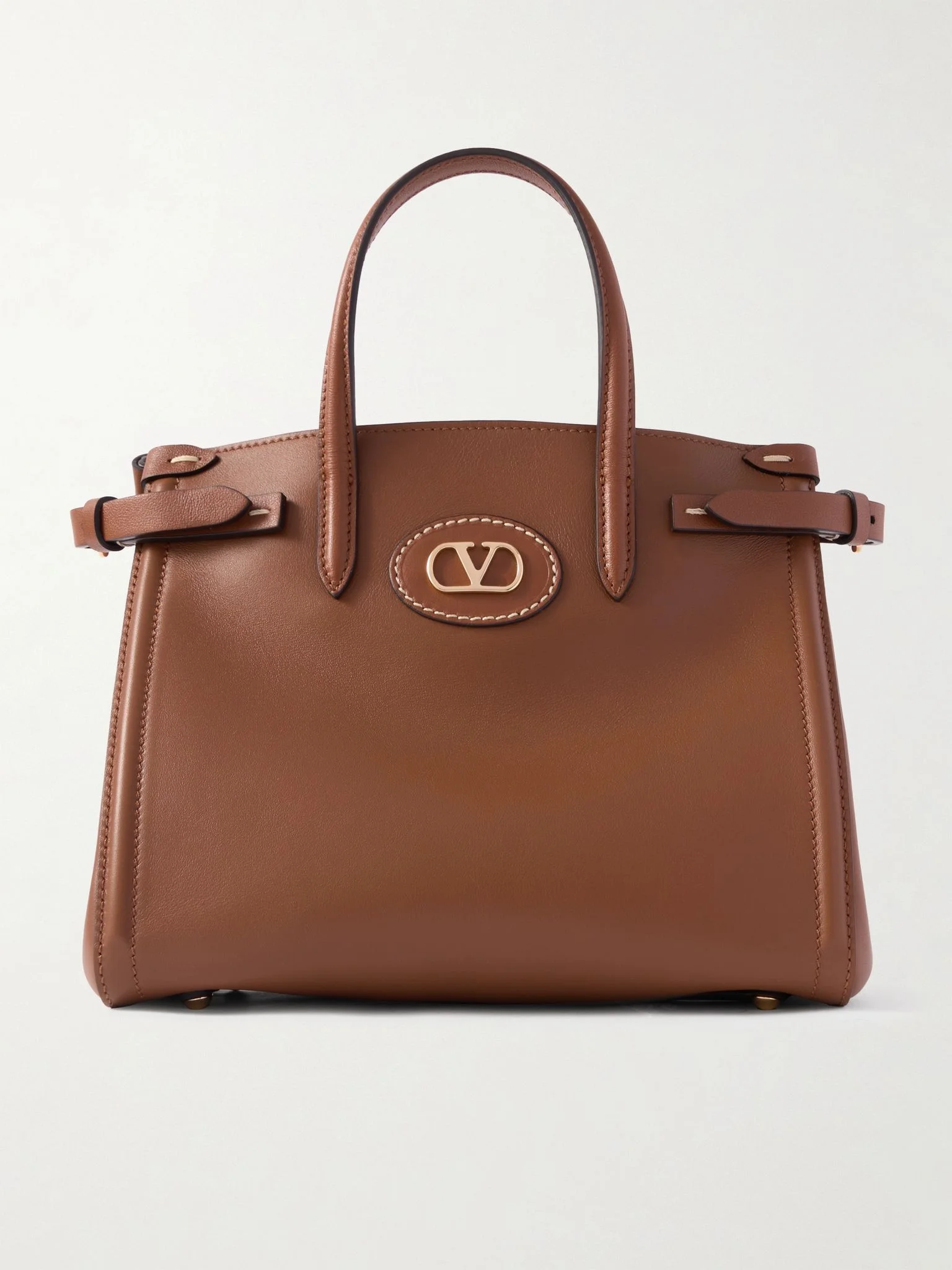 Valentino Garavani's 'Antibes' tote is one you can count on to remain a versatile, timeless staple. Crafted in Italy from supple leather, this small iteration has slim buckled tabs that adjust the shape and features gold-tone hardware, including the 'VLogo'. The suede-lined interior has enough space for your phone, wallet and keys. Details & Care - Brown leather (Calf) - Two top handles, detachable adjustable shoulder strap - Internal zipped pocket - Suede lining - Magnetic-fastening tab at open top